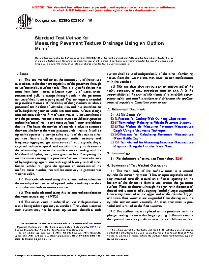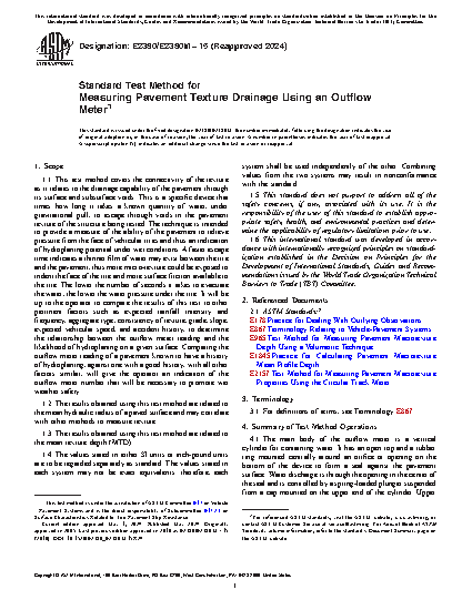 1.1 This test method covers the connectivity of the texture as it relates to the drainage capability of the pavement through its surface and subsurface voids. This is a specific device that times how long it takes a known quantity of water, under gravitational pull, to escape through voids in the pavement texture of the structure being tested. The technique is intended to provide a measure of the ability of the pavement to relieve pressure from the face of vehicular tires and thus an indication of hydroplaning potential under wet conditions. A faster escape time indicates a thinner film of water may exist between the tire and the pavement, thus more micro-texture could be exposed to indent the face of the tire and more surface friction available to the tire. The lower the number of seconds it takes to evacuate the water, the lower the water pressure under the tire. It will be up to the operator to compare the results of this test to other pertinent factors such as expected rainfall intensity and frequency, aggregate type, consistency of texture, grade, slope, expected vehicular speed, and accident history, to determine the relationship between the outflow meter reading and the likelihood of hydroplaning on a given surface. Comparing the outflow meter reading of a pavement known to have a history of hydroplaning, against one with a good history, with all other factors similar, will give the operator an indication of the outflow meter number that will be necessary to promote wet weather safety.