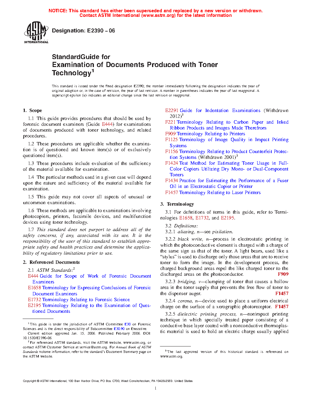 1.1 This guide provides procedures that should be used by forensic document examiners (Guide E 444) for examinations of documents produced with toner technology, and related procedures.