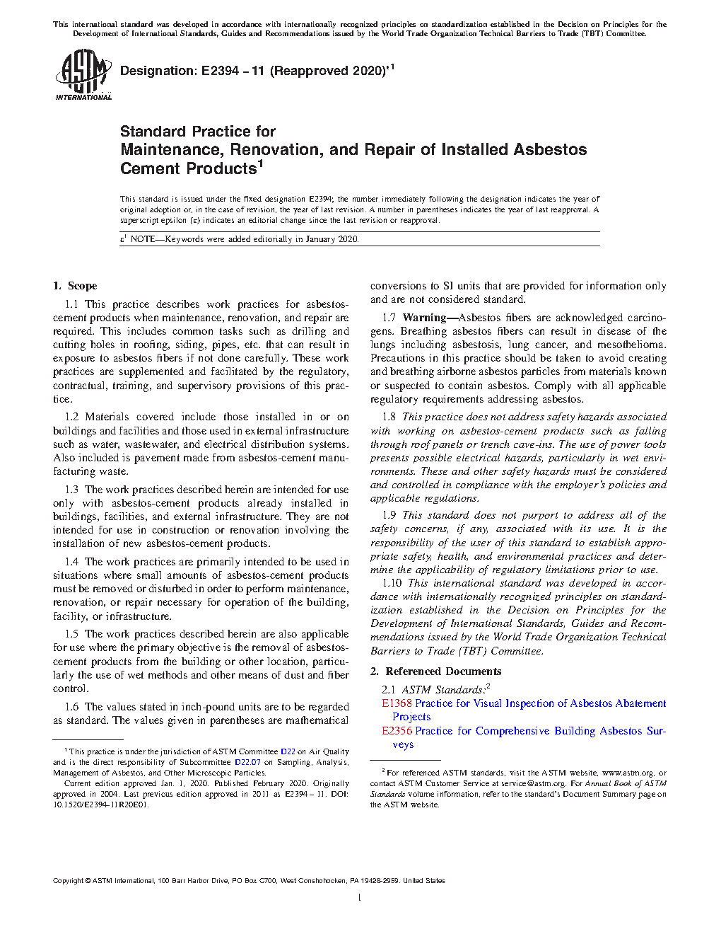 1.3 The work practices described herein are intended for use only with asbestos-cement products already installed in buildings, facilities, and external infrastructure. They are not intended for use in construction or renovation involving the installation of new asbestos-cement products.