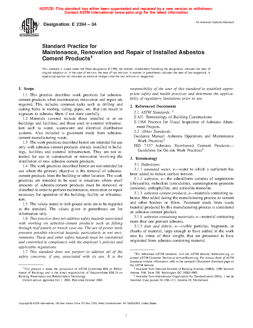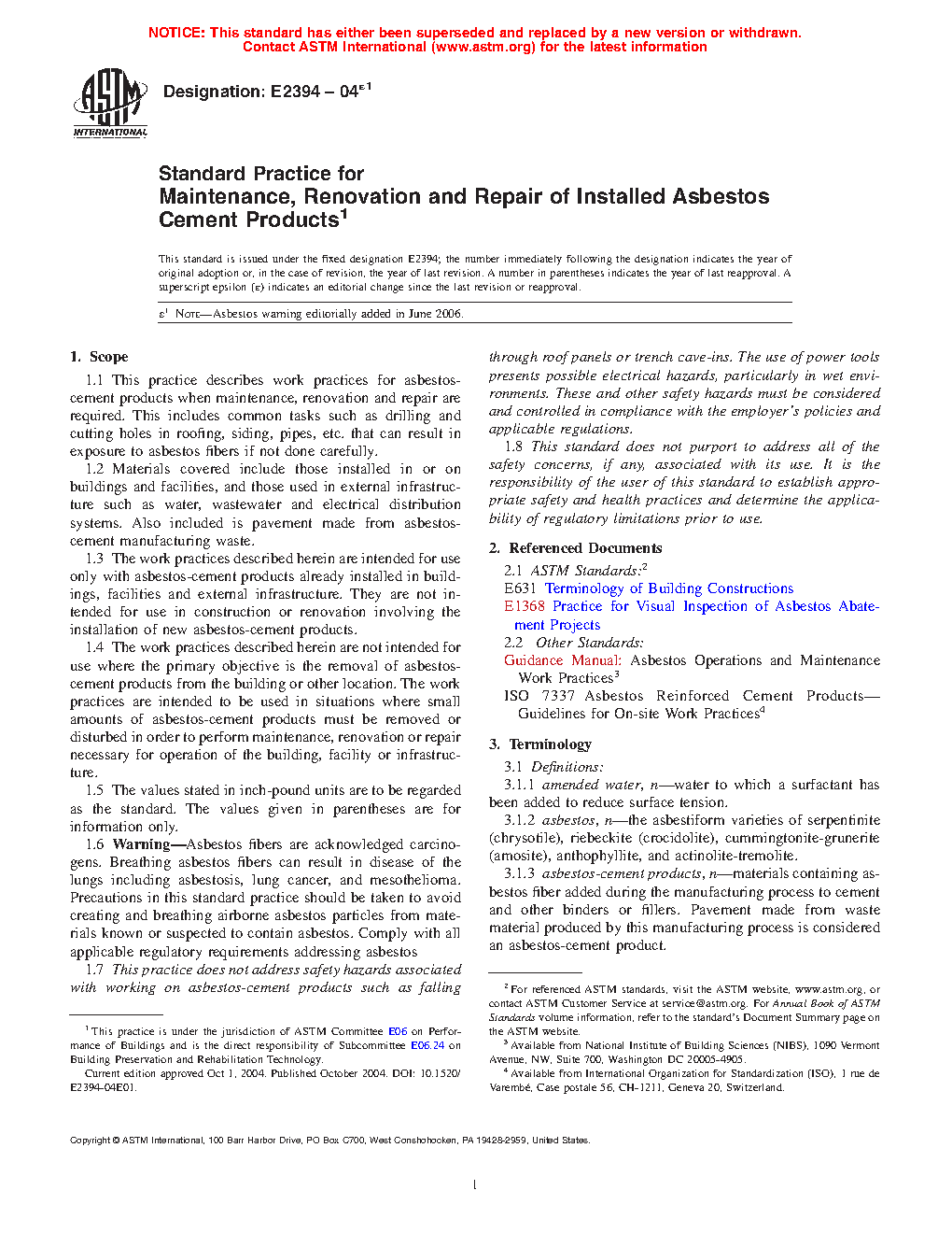 1.1 This practice describes work practices for asbestos-cement products when maintenance, renovation, and repair are required. This includes common tasks such as drilling and cutting holes in roofing, siding, pipes, etc. that can result in exposure to asbestos fibers if not done carefully. These work practices are supplemented and facilitated by the regulatory, contractual, training, and supervisory provisions of this practice.