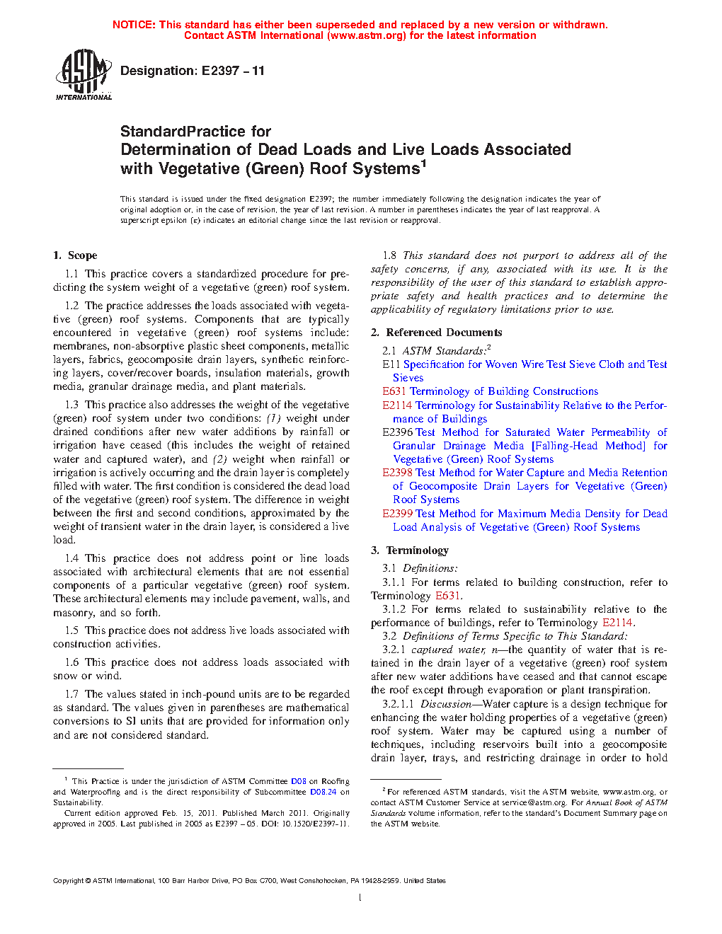 1.3 This practice also addresses the weight of the vegetative (green) roof system under two conditions: (1) weight under drained conditions after new water additions by rainfall or irrigation have ceased (this includes the weight of retained water and captured water), and (2) weight when rainfall or irrigation is actively occurring and the drain layer is completely filled with water. The first condition is considered the dead load of the vegetative (green) roof system. The difference in weight between the first and second conditions, approximated by the weight of transient water in the drain layer, is considered a live load.