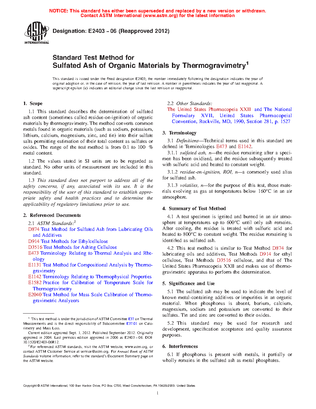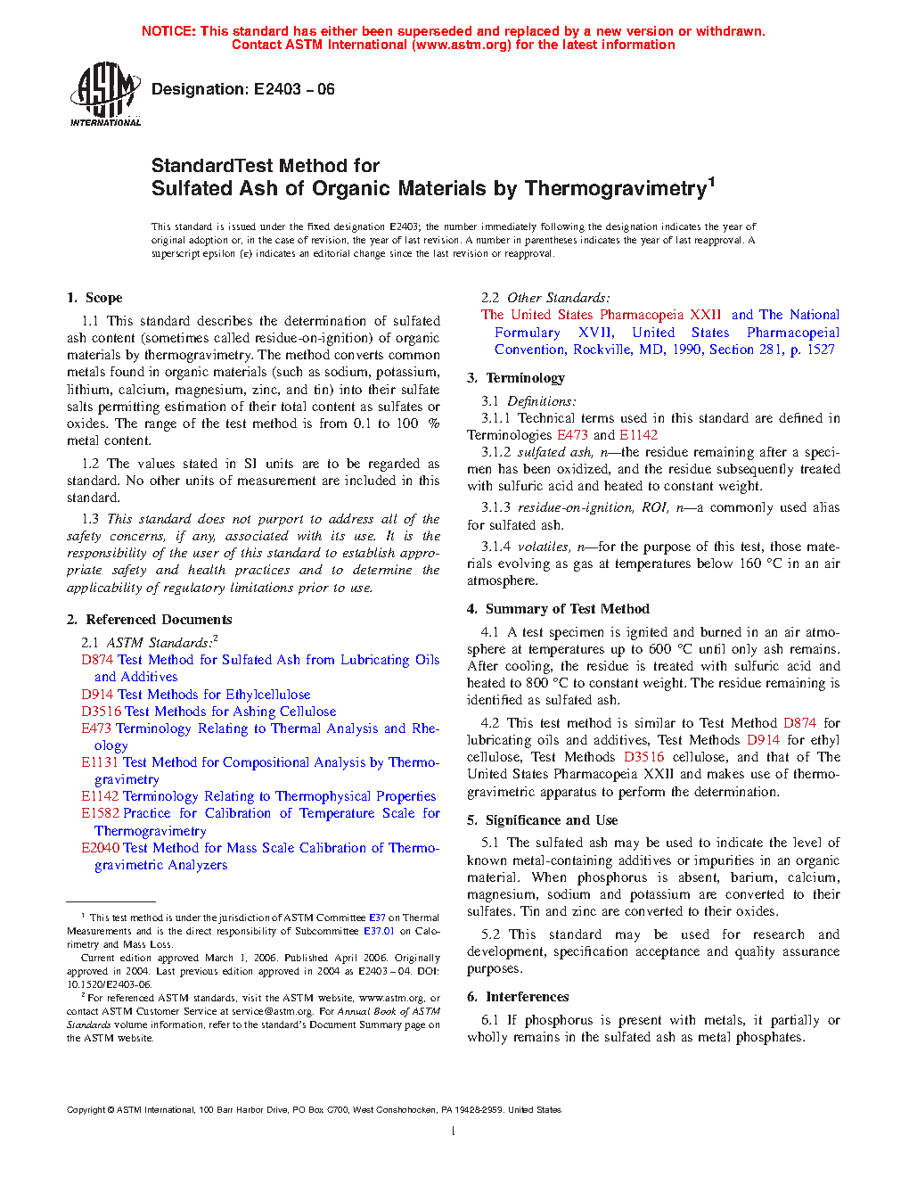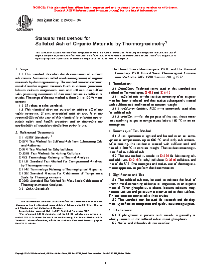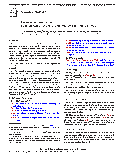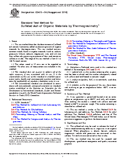 1.1 This test method describes the determination of sulfated ash content (sometimes called residue-on-ignition) of organic materials by thermogravimetry. This test method converts common metals found in organic materials (such as sodium, potassium, lithium, calcium, magnesium, zinc, and tin) into their sulfate salts permitting estimation of their total content as sulfates or oxides. The range of this test method is from 0.1 % to 100 % metal content.