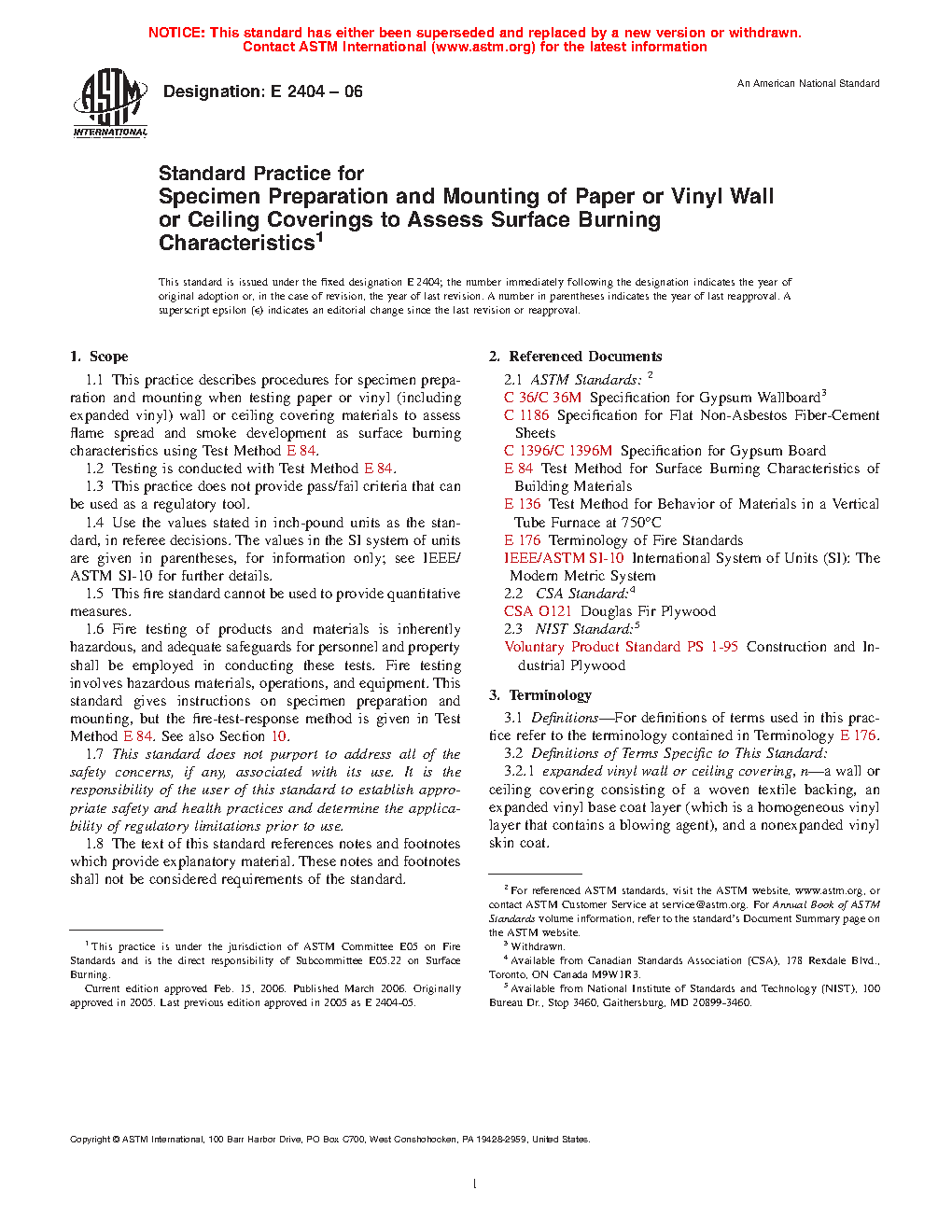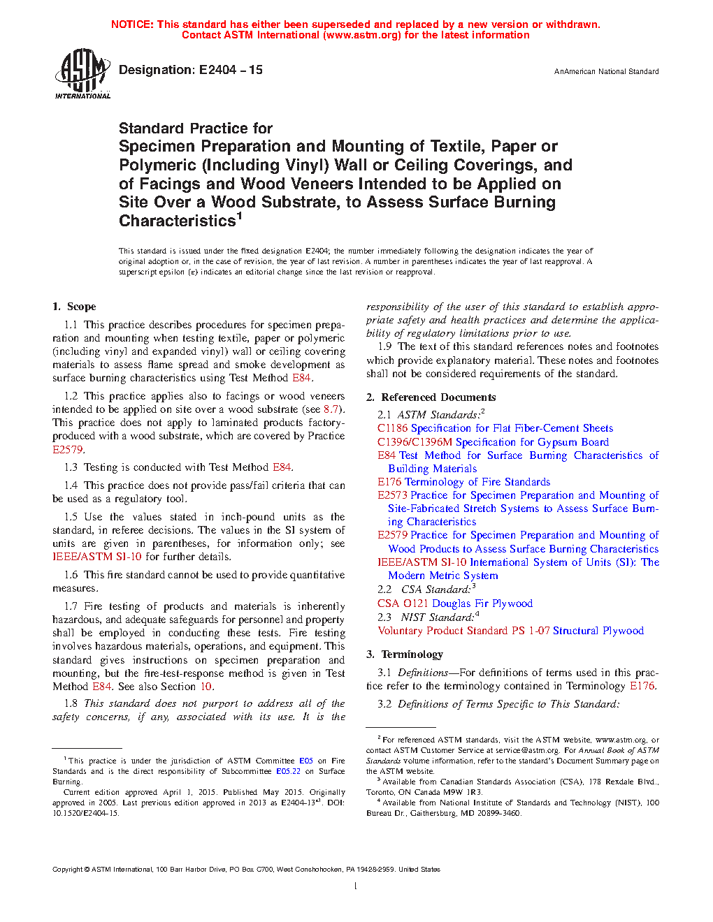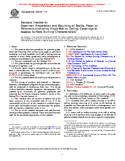 1.1 This practice describes procedures for specimen preparation and mounting when testing textile, paper or polymeric (including vinyl and expanded vinyl) wall or ceiling covering materials to assess flame spread and smoke development as surface burning characteristics using Test Method E84.