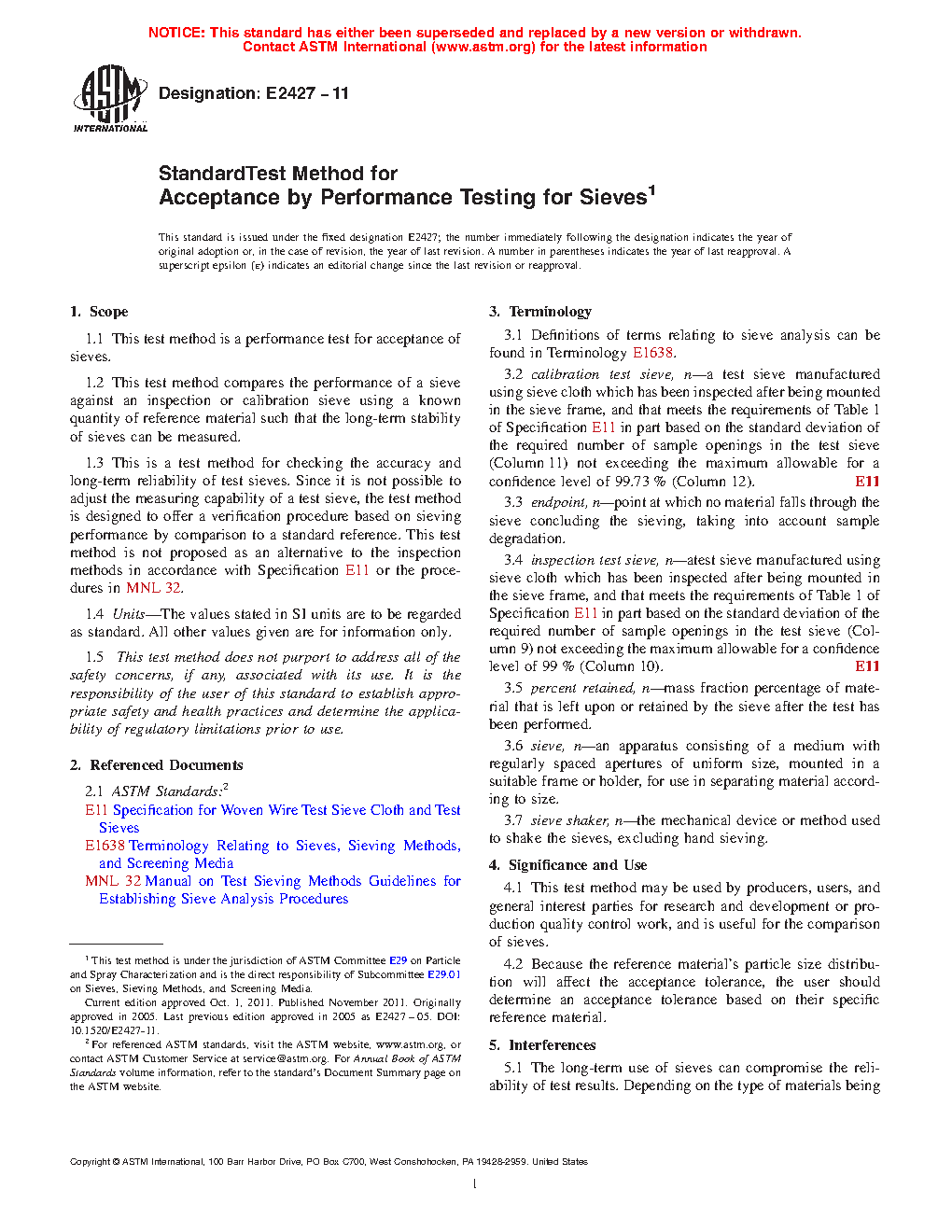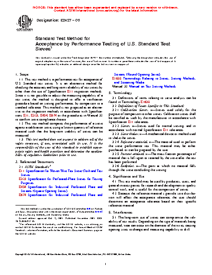 1.3 This is a test method for checking the accuracy and long-term reliability of test sieves. Since it is not possible to adjust the measuring capability of a test sieve, the test method is designed to offer a verification procedure based on sieving performance by comparison to a standard reference. This test method is not proposed as an alternative to the inspection methods in accordance with Specification E11 or the procedures in MNL 32.