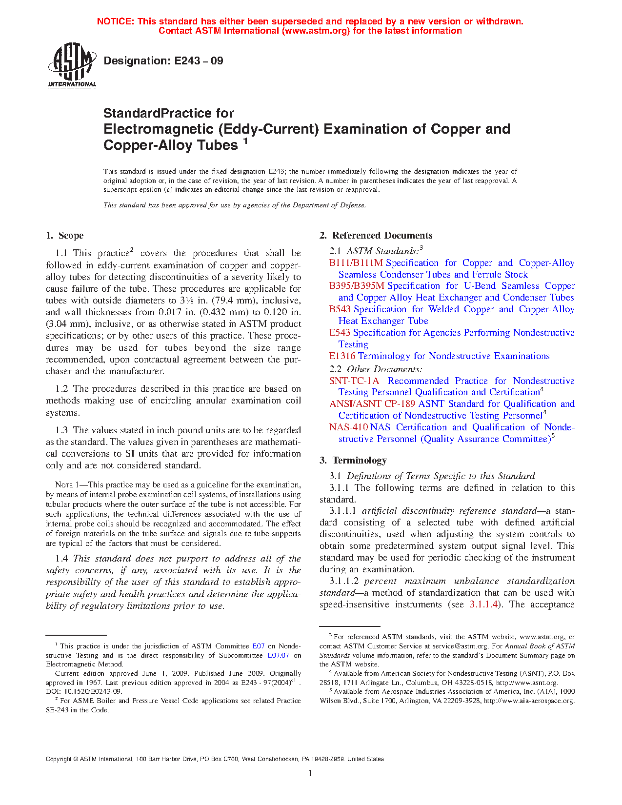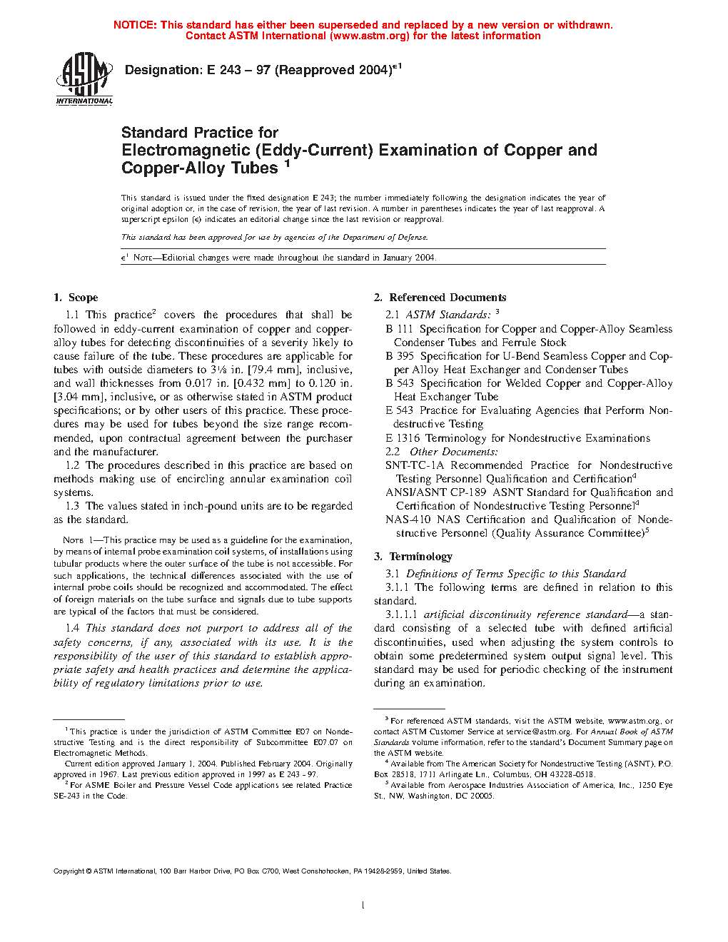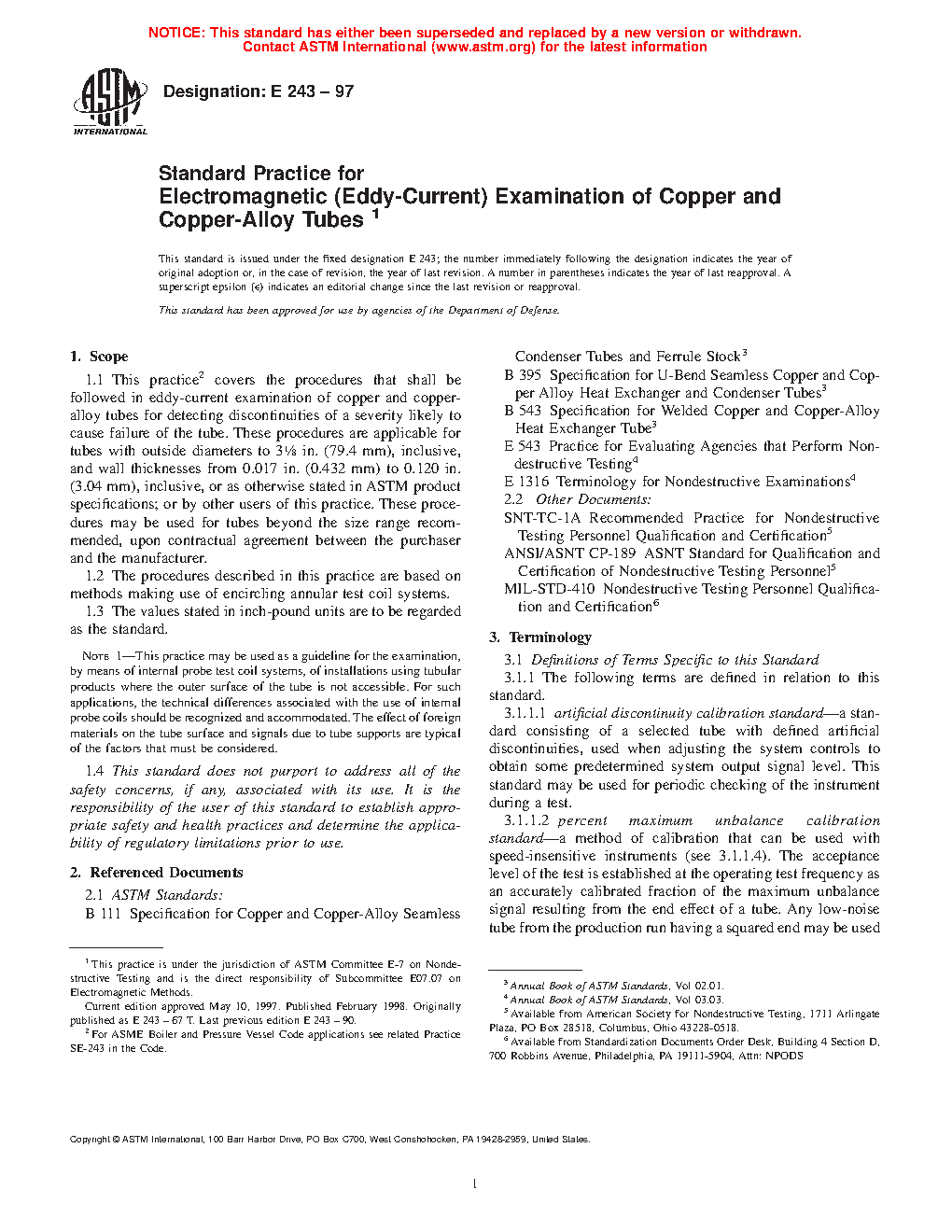 1.1 This practice covers the procedures that shall be followed in eddy-current examination of copper and copper-alloy tubes for detecting discontinuities of a severity likely to cause failure of the tube. These procedures are applicable for tubes with outside diameters to 31/8 in. (79.4 mm), inclusive, and wall thicknesses from 0.017 in. (0.432 mm) to 0.120 in. (3.04 mm), inclusive, or as otherwise stated in ASTM product specifications; or by other users of this practice. These procedures may be used for tubes beyond the size range recommended, upon contractual agreement between the purchaser and the manufacturer.