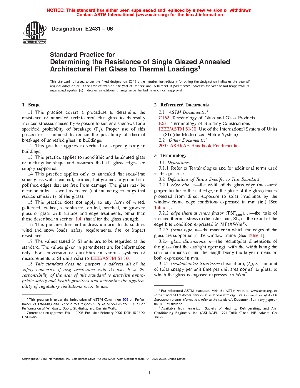 1.1 This practice covers a procedure to determine the resistance of annealed architectural flat glass to thermally induced stresses caused by exposure to sun and shadows for a specified probability of breakage (P