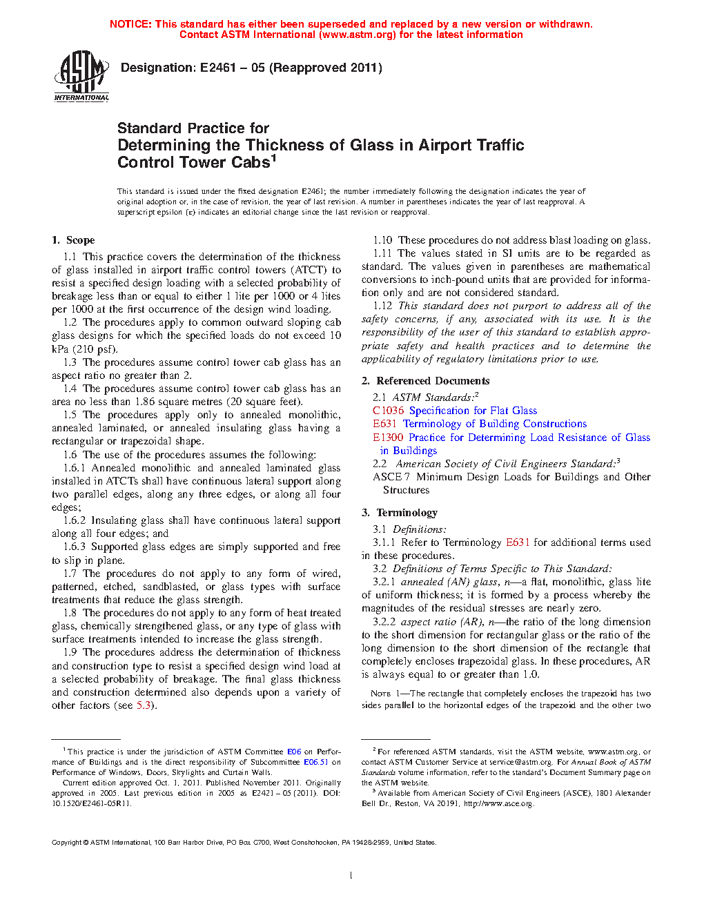 1.1 This practice covers the determination of the thickness of glass installed in airport traffic control towers (ATCT) to resist a specified design loading with a selected probability of breakage less than or equal to either 1 lite per 1000 or 4 lites per 1000 at the first occurrence of the design wind loading.