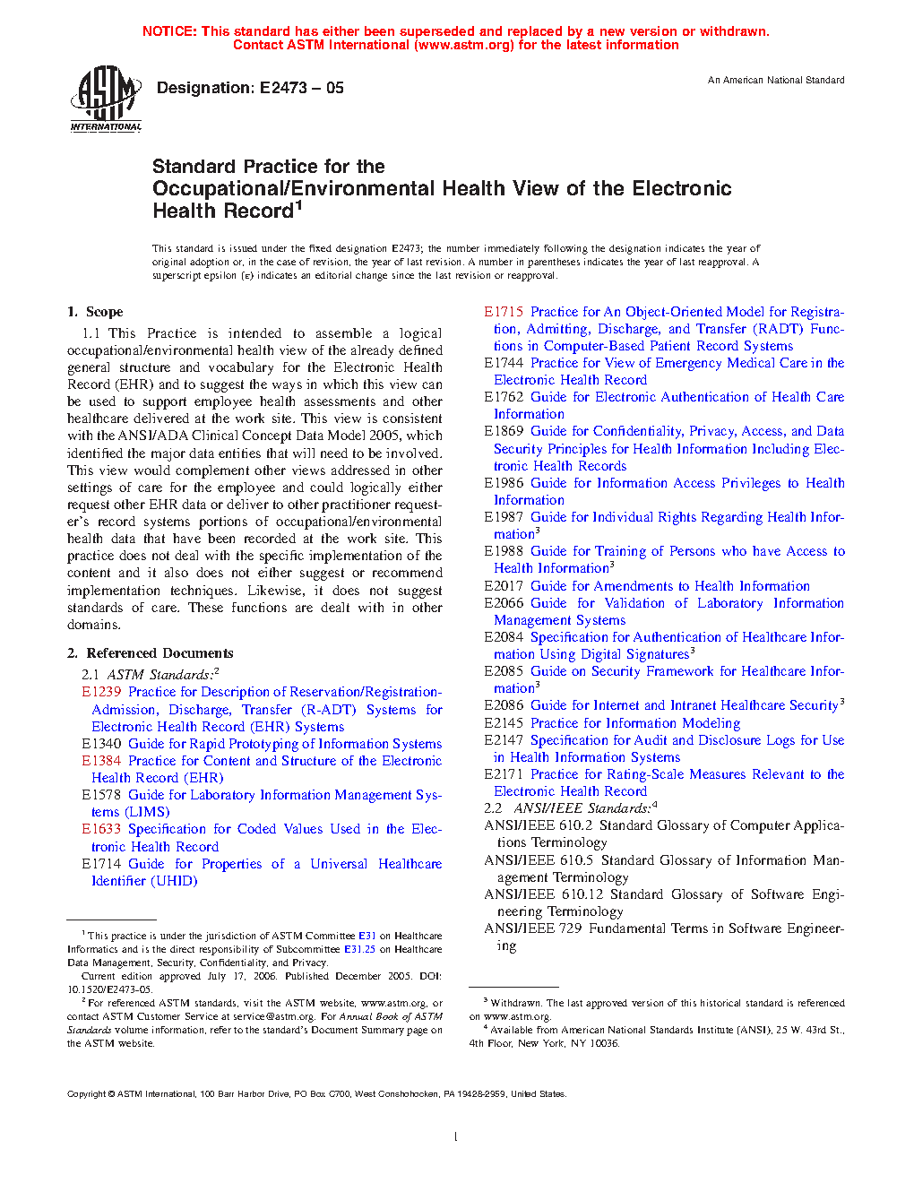 1.1 This Practice is intended to assemble a logical occupational/environmental health view of the already defined general structure and vocabulary for the Electronic Health Record (EHR) and to suggest the ways in which this view can be used to support employee health assessments and other healthcare delivered at the work site. This view is consistent with the ANSI/ADA Clinical Concept Data Model 2005, which identified the major data entities that will need to be involved. This view would complement other views addressed in other settings of care for the employee and could logically either request other EHR data or deliver to other practitioner requester’s record systems portions of occupational/environmental health data that have been recorded at the work site. This practice does not deal with the specific implementation of the content and it also does not either suggest or recommend implementation techniques. Likewise, it does not suggest standards of care. These functions are dealt with in other domains.