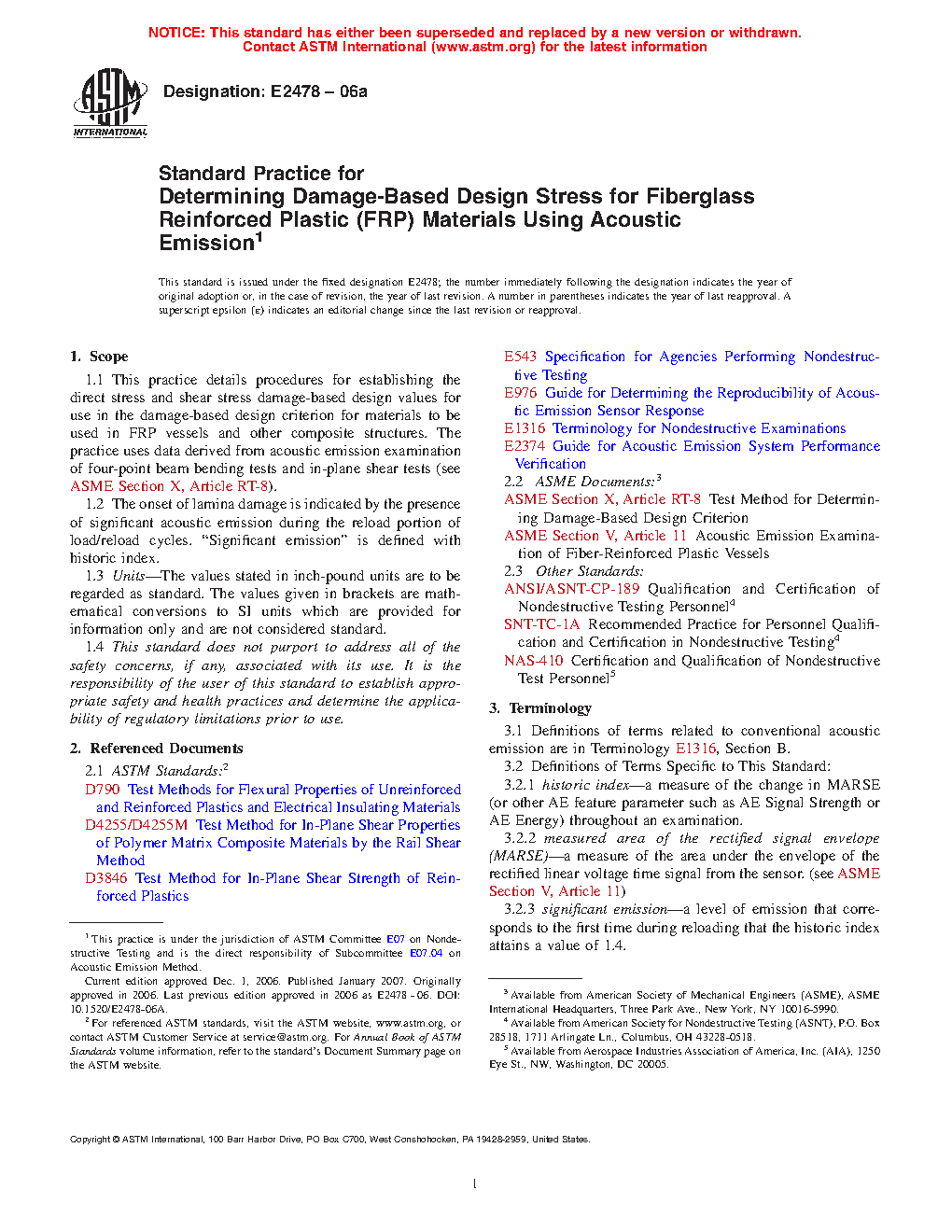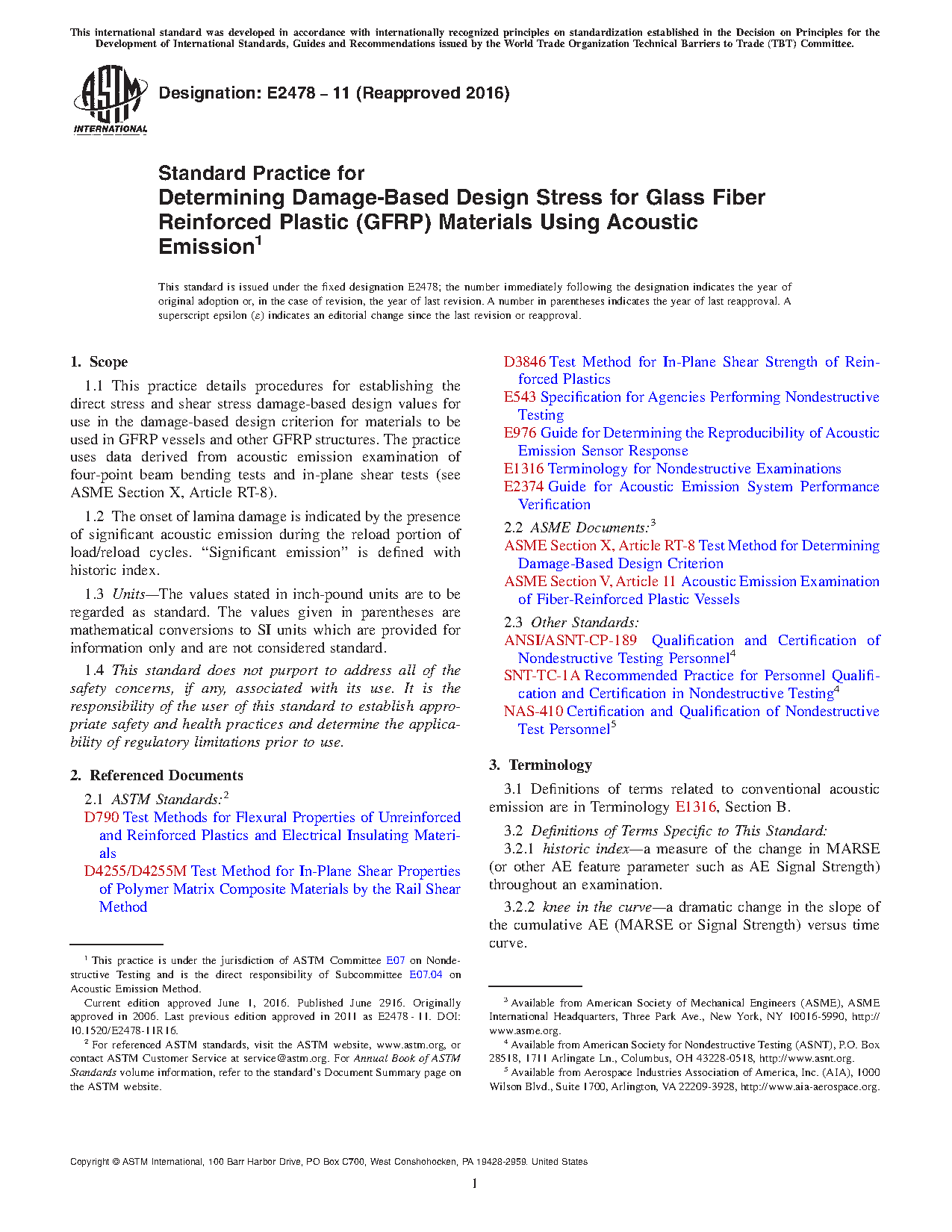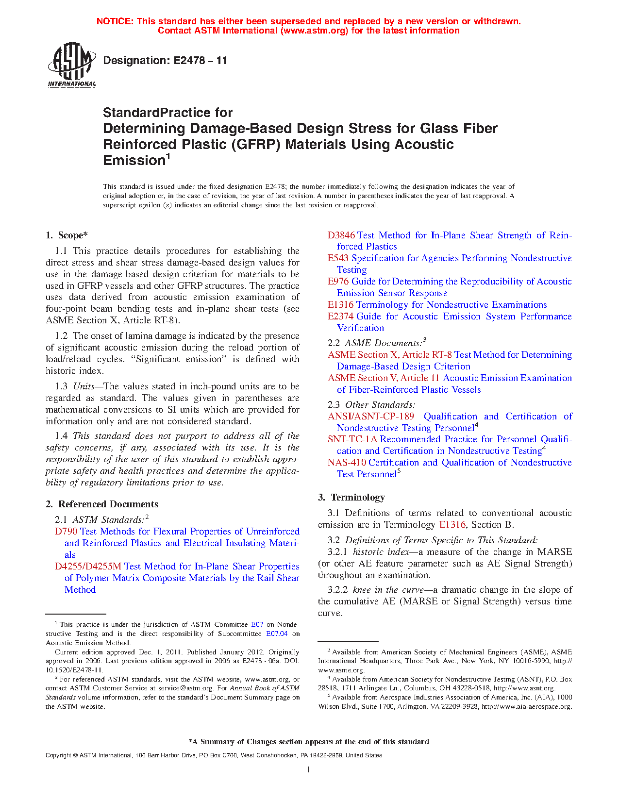 1.1 This practice details procedures for establishing the direct stress and shear stress damage-based design values for use in the damage-based design criterion for materials to be used in GFRP vessels and other GFRP structures. The practice uses data derived from acoustic emission examination of four-point beam bending tests and in-plane shear tests (see ASME Section X, Article RT-8).