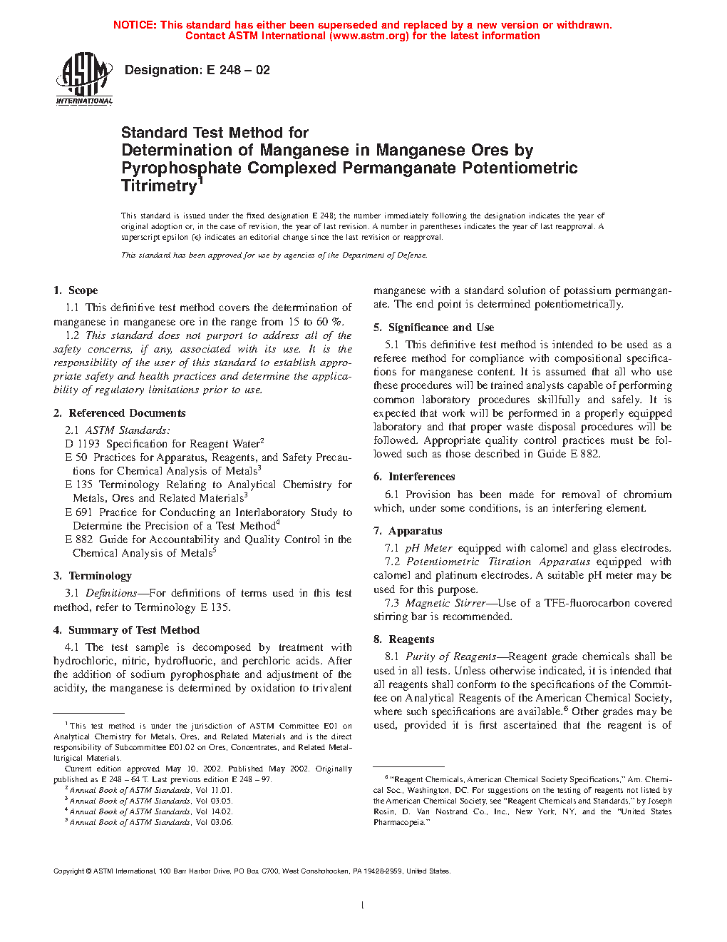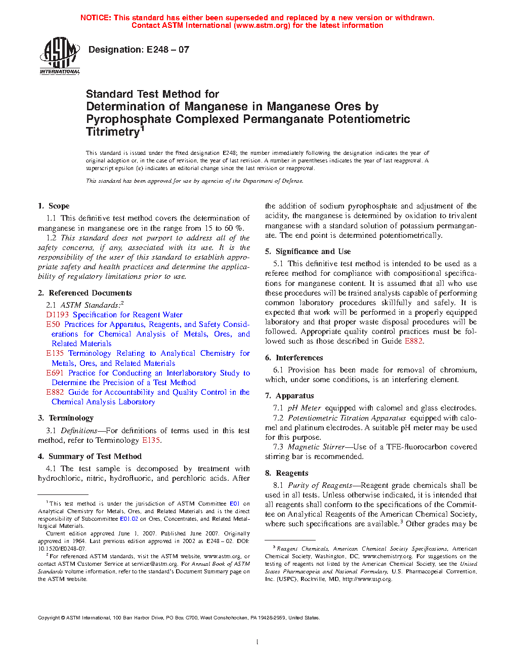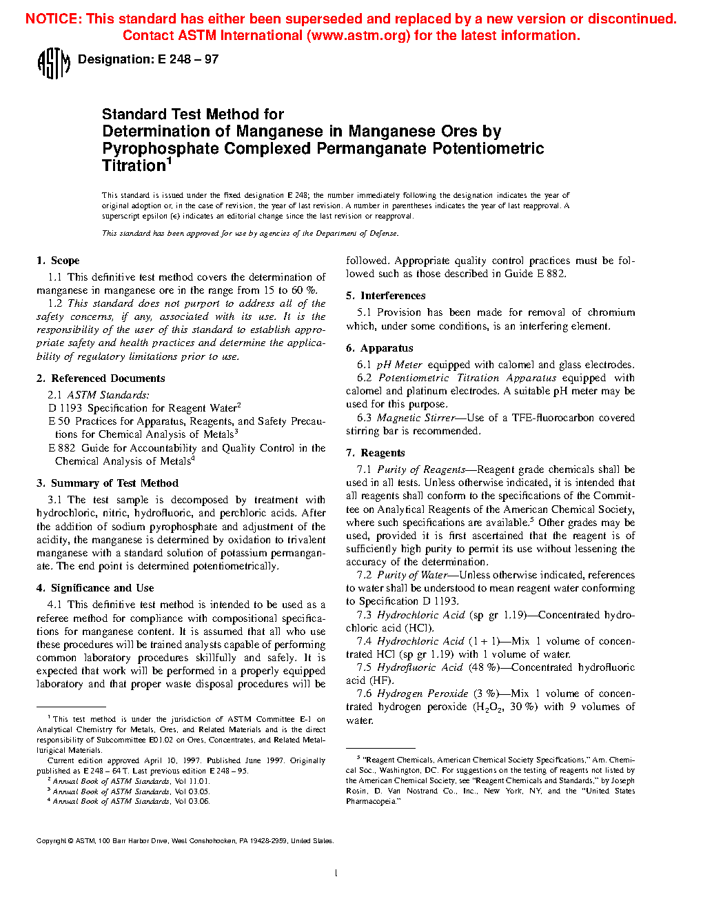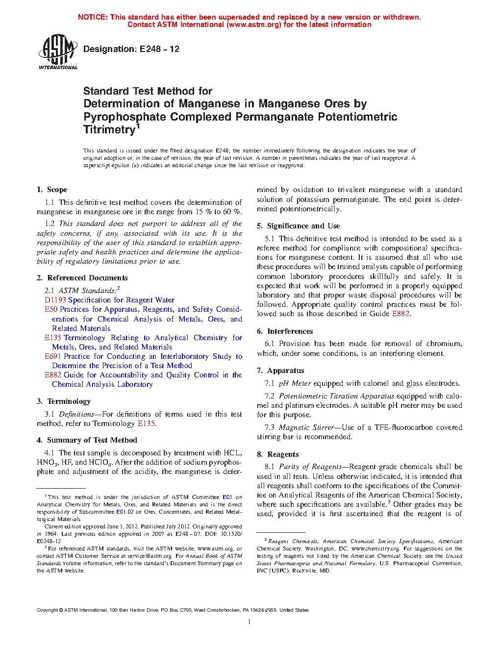 This definitive test method is intended to be used as a referee method for compliance with compositional specifications for manganese content. It is assumed that all who use these procedures will be trained analysts capable of performing common laboratory procedures skillfully and safely. It is expected that work will be performed in a properly equipped laboratory and that proper waste disposal procedures will be followed. Appropriate quality control practices must be followed such as those described in Guide E 882
