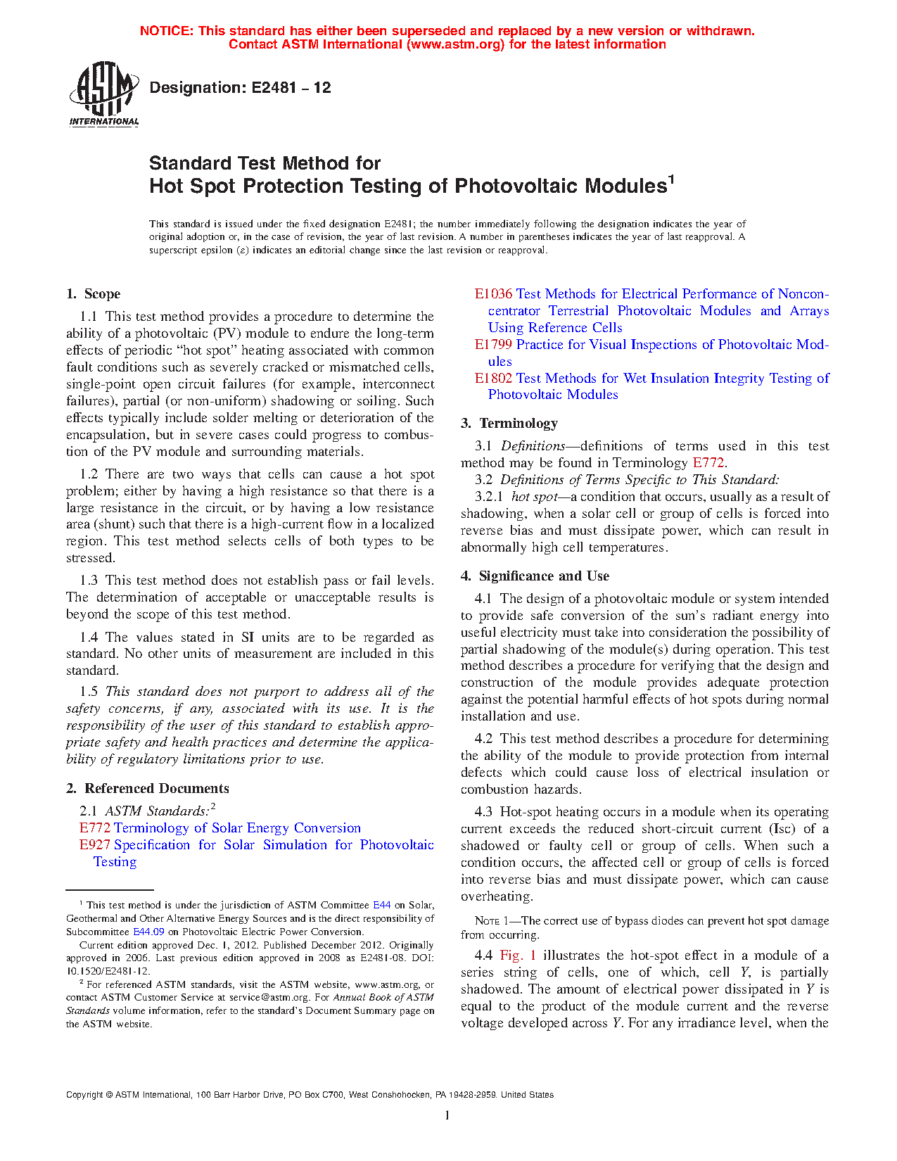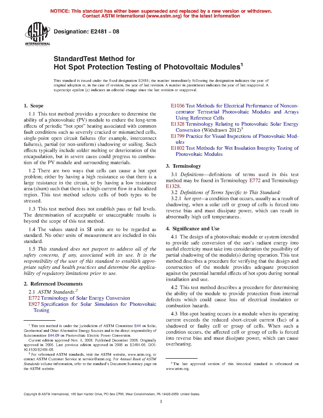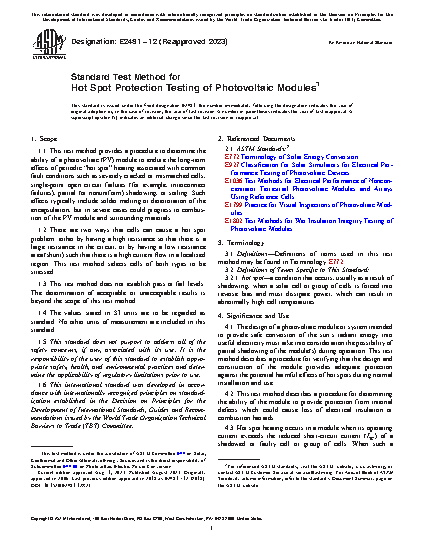 1.1 This test method provides a procedure to determine the ability of a photovoltaic (PV) module to endure the long-term effects of periodic “hot spot” heating associated with common fault conditions such as severely cracked or mismatched cells, single-point open circuit failures (for example, interconnect failures), partial (or non-uniform) shadowing or soiling. Such effects typically include solder melting or deterioration of the encapsulation, but in severe cases could progress to combustion of the PV module and surrounding materials.