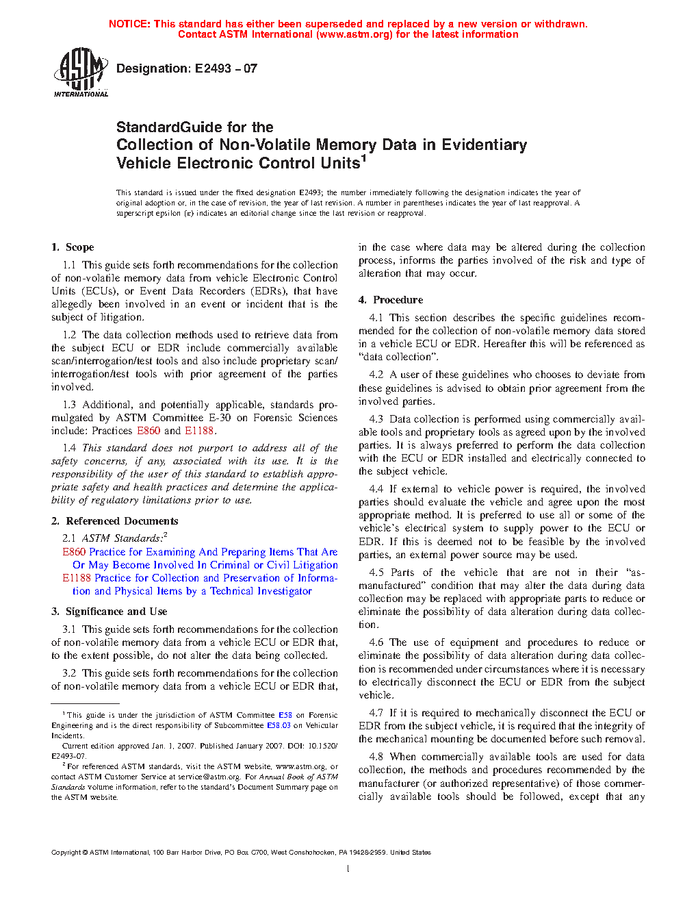 1.1 This guide sets forth recommendations for the collection of non-volatile memory data from vehicle Electronic Control Units (ECUs), or Event Data Recorders (EDRs), that have allegedly been involved in an event or incident that is the subject of litigation.