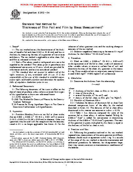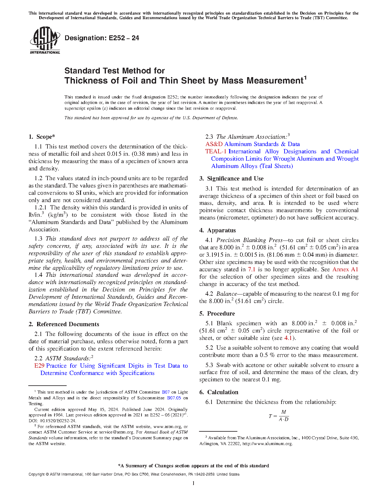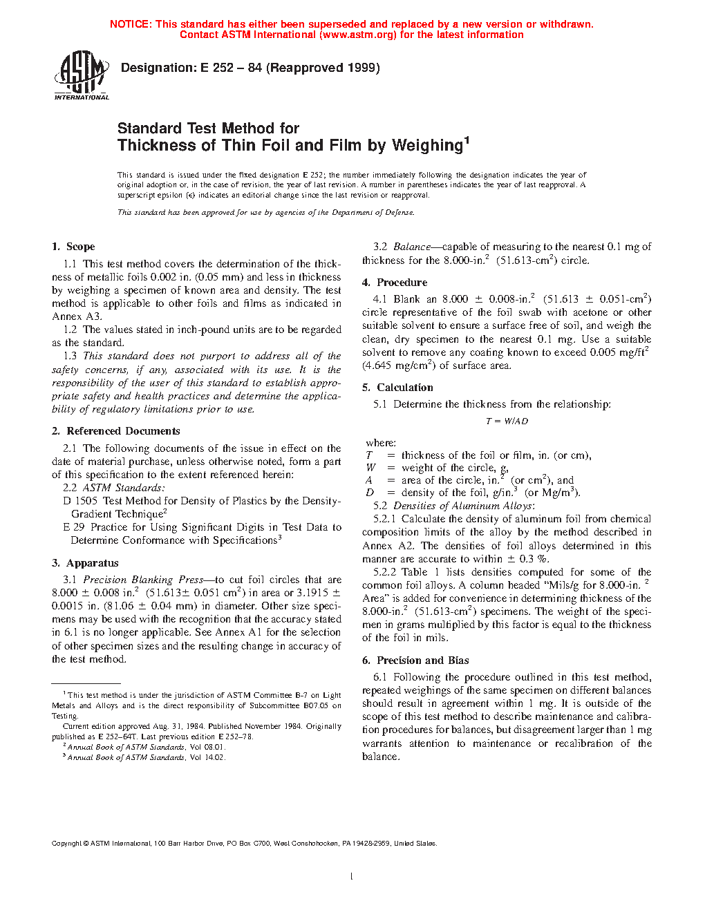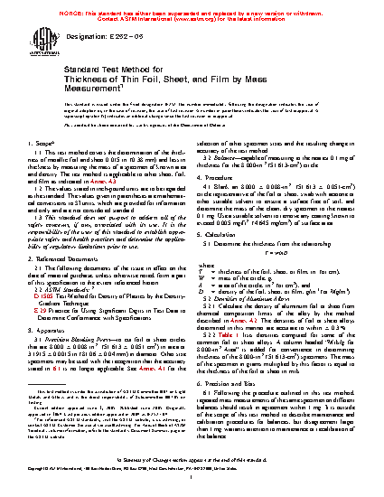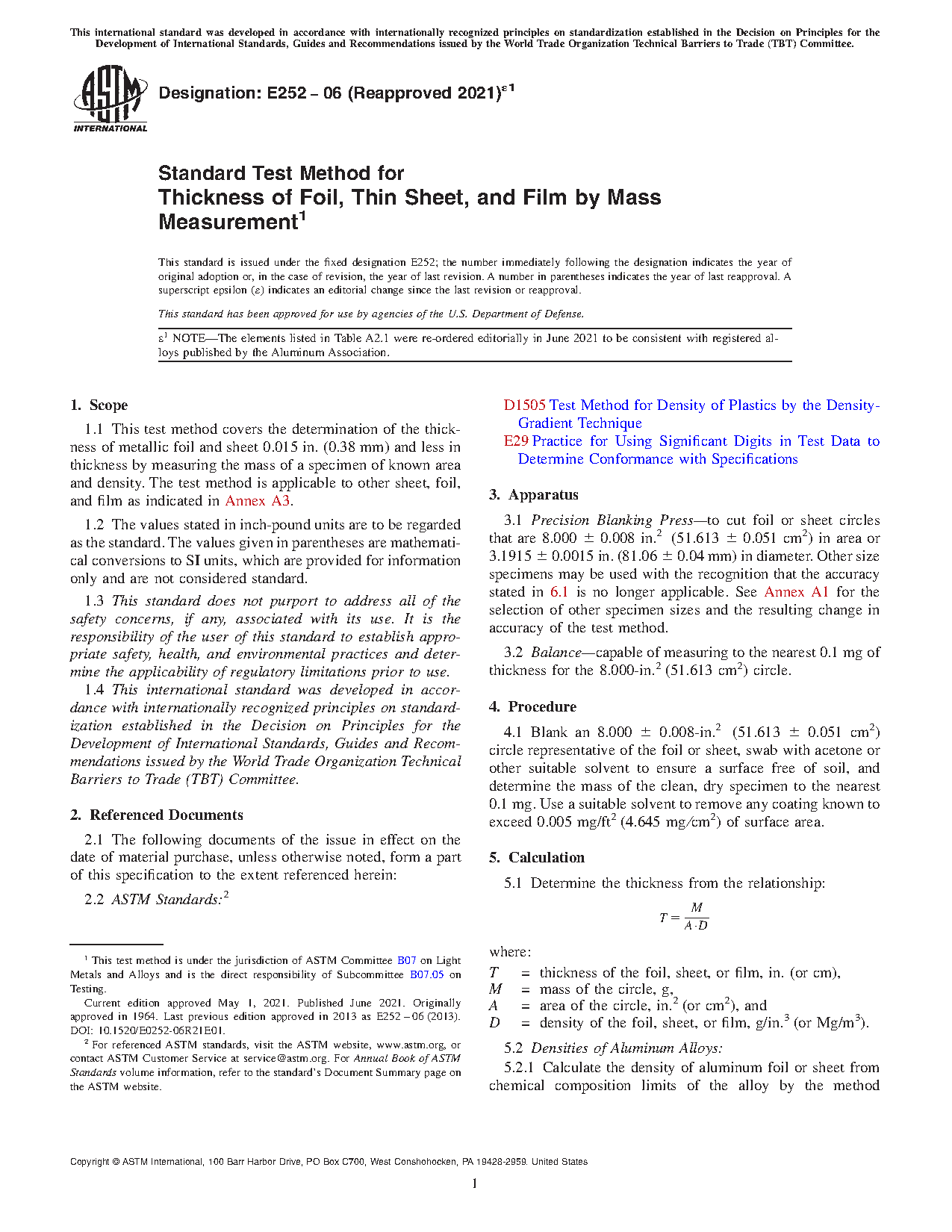 1.1 This test method covers the determination of the thickness of metallic foil and sheet 0.015 in. (0.38 mm) and less in thickness by measuring the mass of a specimen of known area and density. The test method is applicable to other sheet, foil, and film as indicated in Annex A3.
