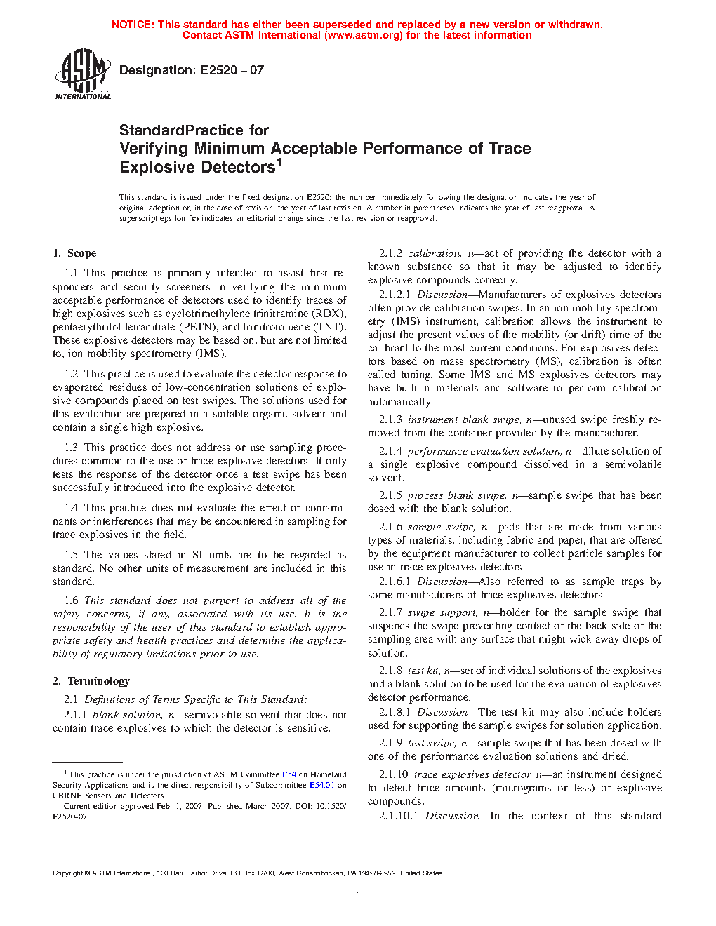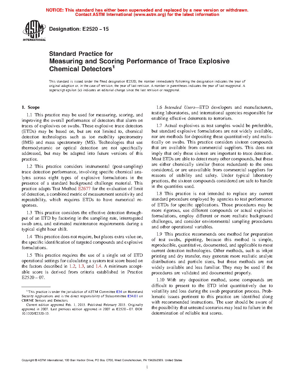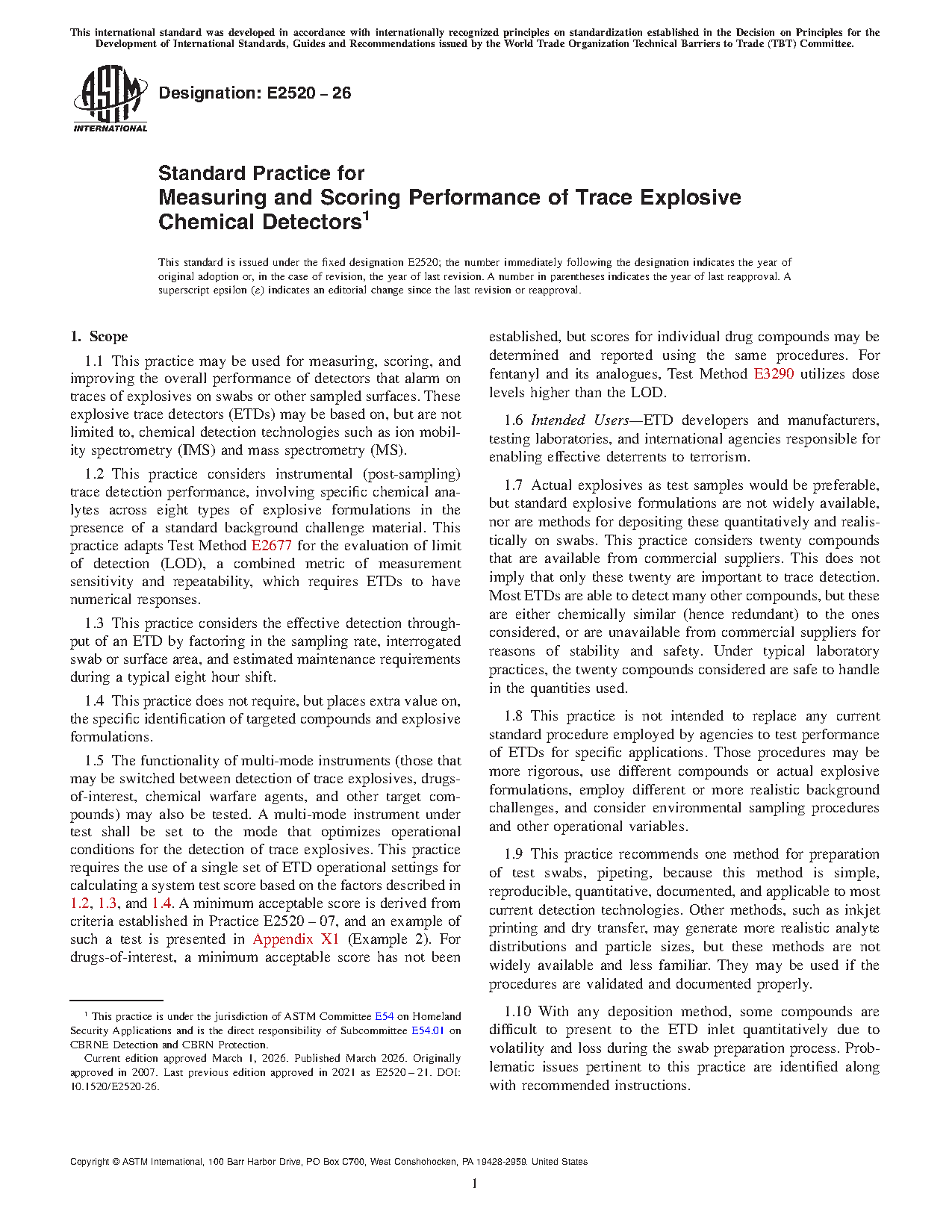 1.5 The functionality of multi-mode instruments (those that may be switched between detection of trace explosives, drugs of interest, chemical warfare agents, and other target compounds) may also be tested. A multi-mode instrument under test shall be set to the mode that optimizes operational conditions for the detection of trace explosives. This practice requires the use of a single set of ETD operational settings for calculating a system test score based on the factors described in 1.2, 1.3, and 1.4. A minimum acceptable score is derived from criteria established in Practice E2520 – 07, and an example of such a test is presented in Appendix X1 (Example 2).