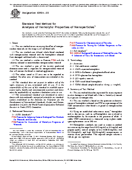 1.4 This test method is part of the in-vitro preclinical characterization and is important for nanoparticulate material that will contact the blood in medical applications.