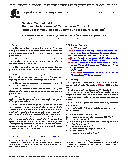 1.1 This test method covers the determination of the electrical performance of photovoltaic concentrator modules and systems under natural sunlight using a normal incidence pyrheliometer.