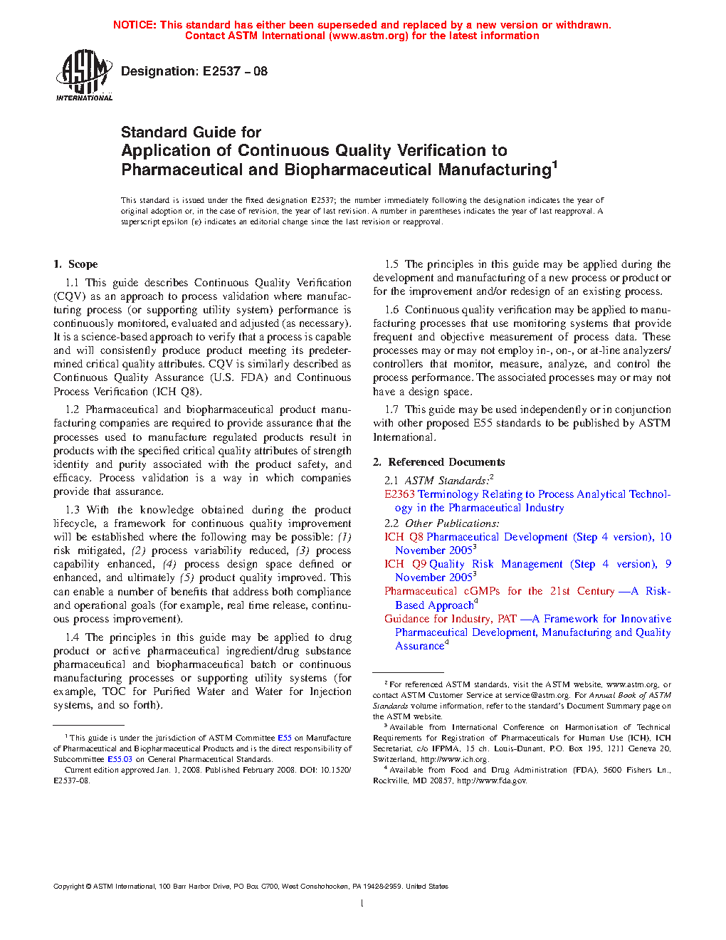1.1 This guide describes Continuous Quality Verification (CQV) as an approach to process validation where manufacturing process (or supporting utility system) performance is continuously monitored, evaluated and adjusted (as necessary). It is a science-based approach to verify that a process is capable and will consistently produce product meeting its predetermined critical quality attributes. CQV is similarly described as Continuous Quality Assurance (U.S. FDA) and Continuous Process Verification (ICH Q8).