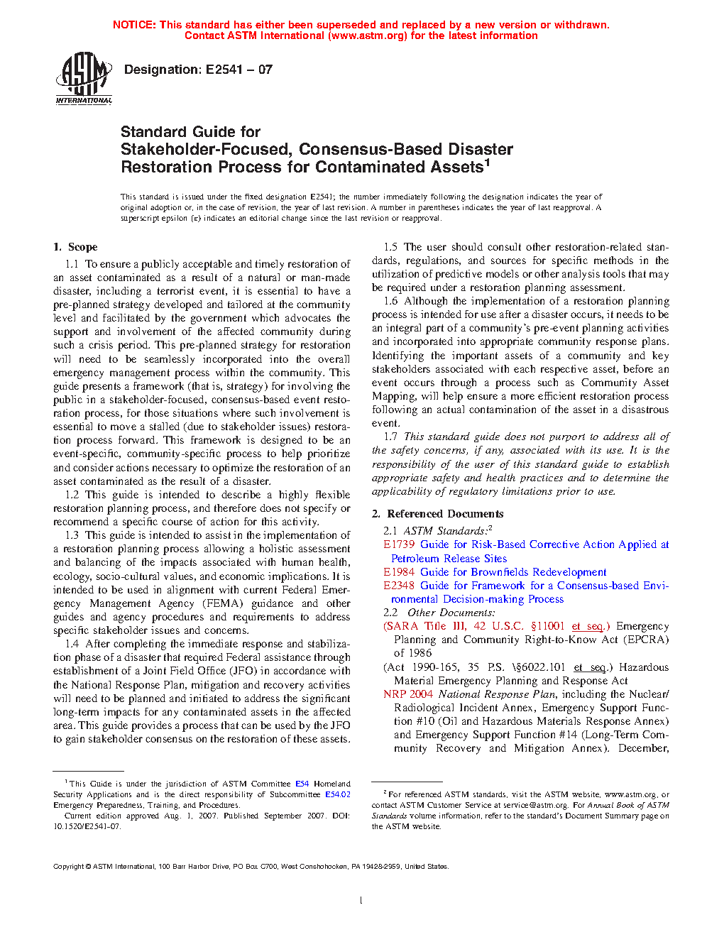 1.1 To ensure a publicly acceptable and timely restoration of an asset contaminated as a result of a natural or man-made disaster, including a terrorist event, it is essential to have a pre-planned strategy developed and tailored at the community level and facilitated by the government which advocates the support and involvement of the affected community during such a crisis period. This pre-planned strategy for restoration will need to be seamlessly incorporated into the overall emergency management process within the community. This guide presents a framework (that is, strategy) for involving the public in a stakeholder-focused, consensus-based event restoration process, for those situations where such involvement is essential to move a stalled (due to stakeholder issues) restoration process forward. This framework is designed to be an event-specific, community-specific process to help prioritize and consider actions necessary to optimize the restoration of an asset contaminated as the result of a disaster.
