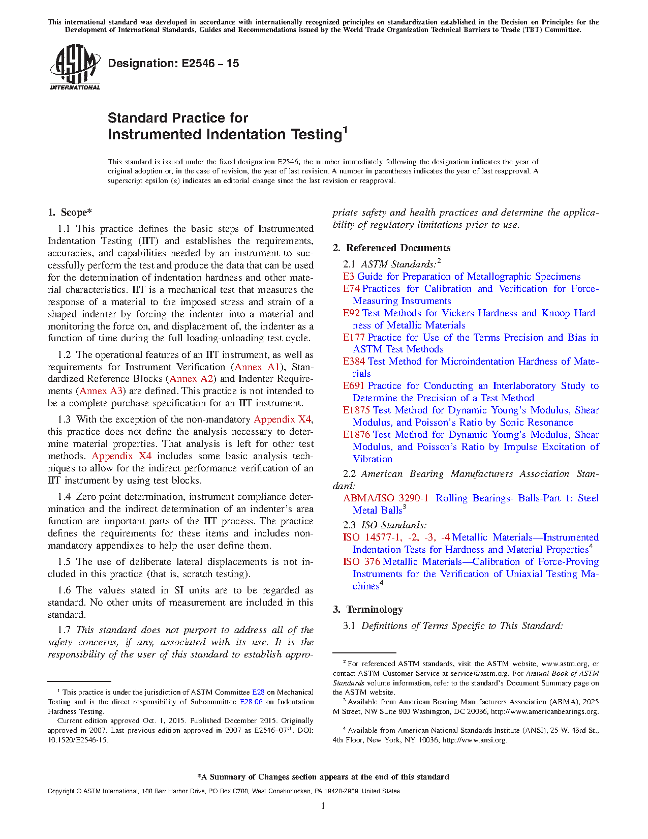 1.2 The operational features of an IIT instrument, as well as requirements for Instrument Verification Annex A1), Standardized Reference Blocks (Annex A2) and Indenter Requirements (Annex A3) are defined. This practice is not intended to be a complete purchase specification for an IIT instrument.
