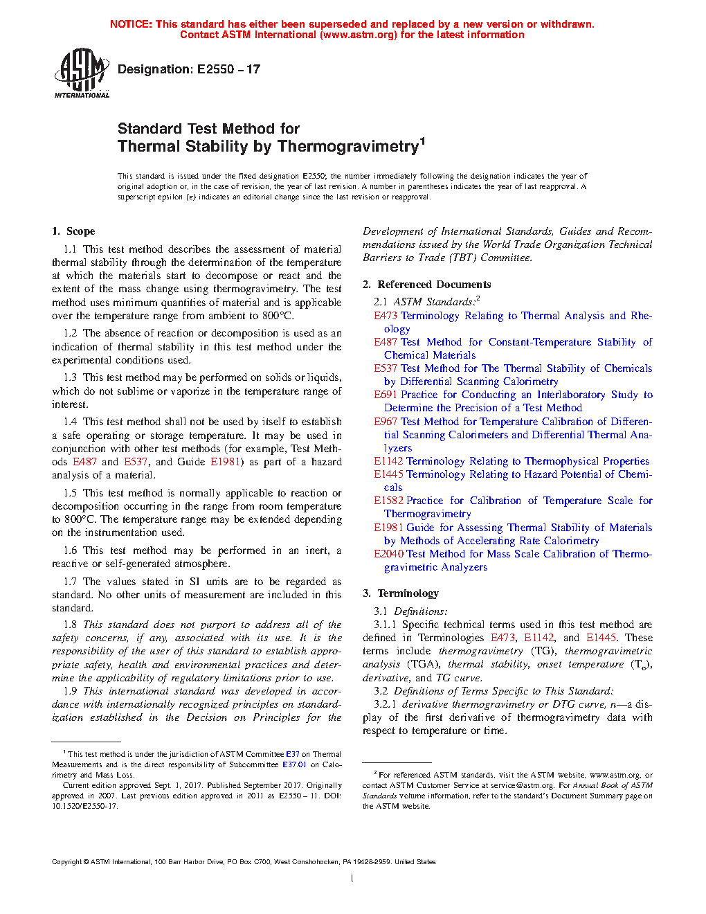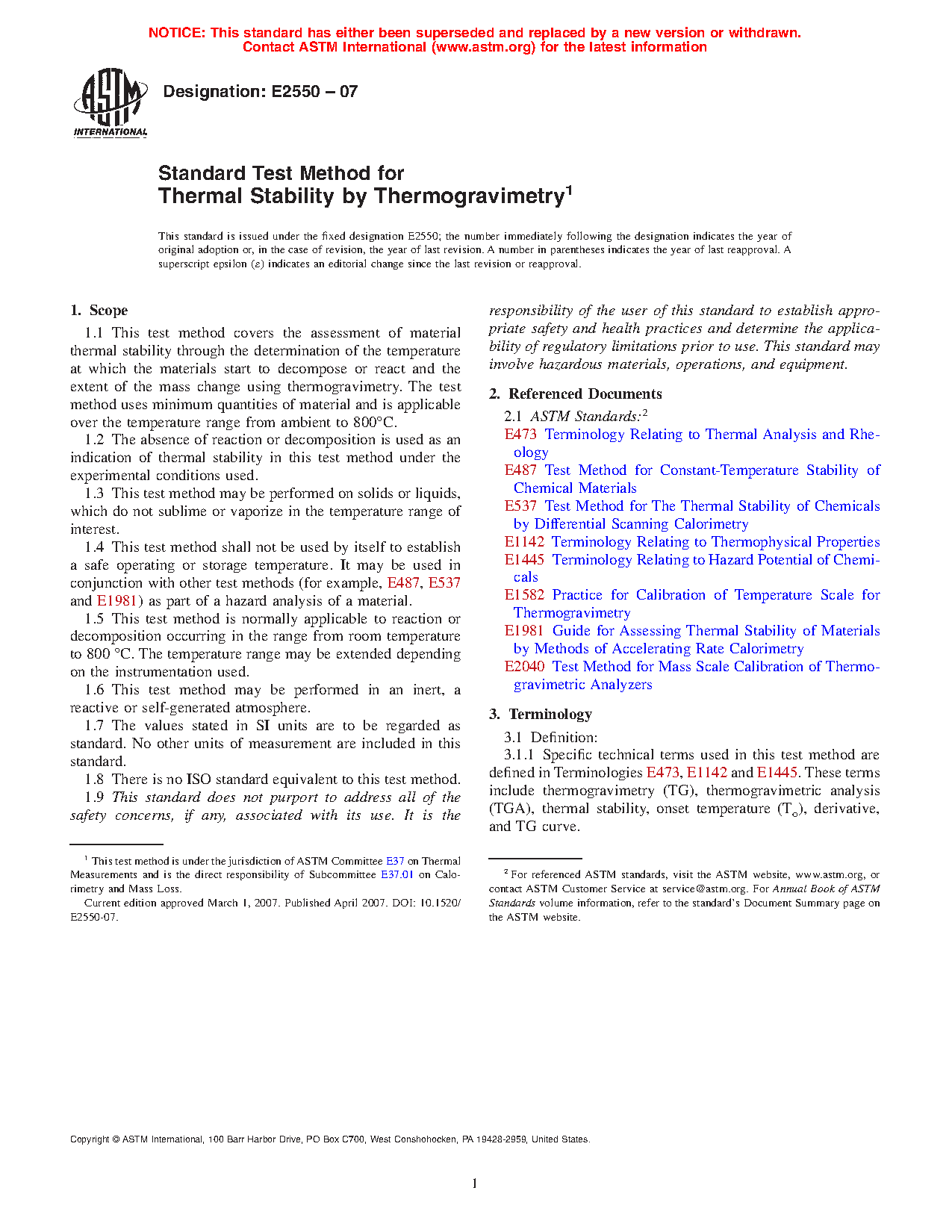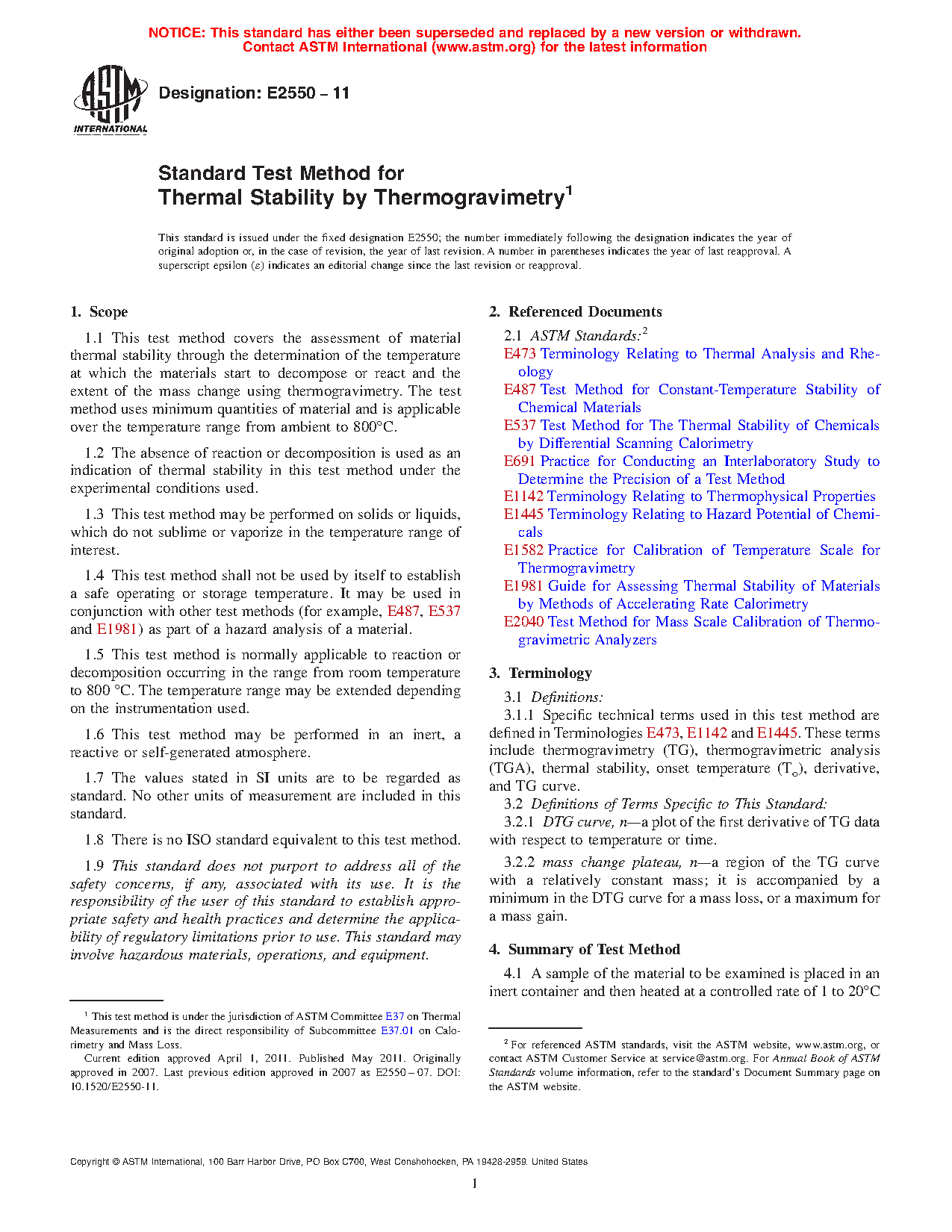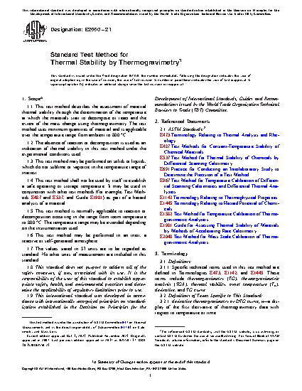 1.1 This test method covers the assessment of material thermal stability through the determination of the temperature at which the materials start to decompose or react and the extent of the mass change using thermogravimetry. The test method uses minimum quantities of material and is applicable over the temperature range from ambient to 800°C.