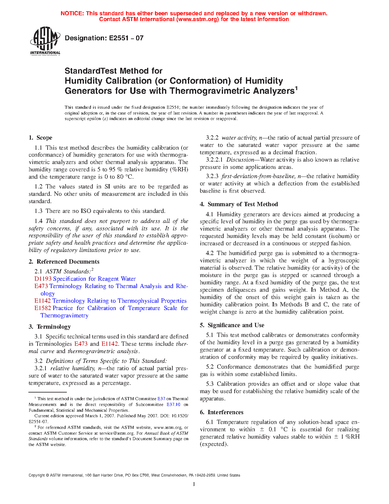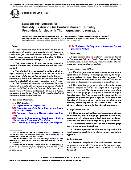 1.1 These test methods describe the humidity calibration (or conformance) of humidity generators for use with thermogravimetric analyzers and other thermal analysis apparatus. The humidity range covered is 5 % relative humidity (% RH) to 95 % RH and the temperature range is 0 °C to 80 °C.