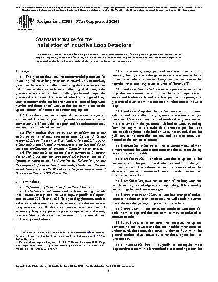 1.1 This practice describes the recommended procedure for installing inductive loop detectors in sawed slots in roadway pavement for use as a traffic monitoring device or to actuate traffic control devices such as a traffic signal. Although the practice is not intended for installing preformed loops, the practice does contain information of value for this type of loop, such as recommendations for the number of turns of loop wire, number and direction of twists in the lead-in wire and cable, splice location (if needed), and grounding options.