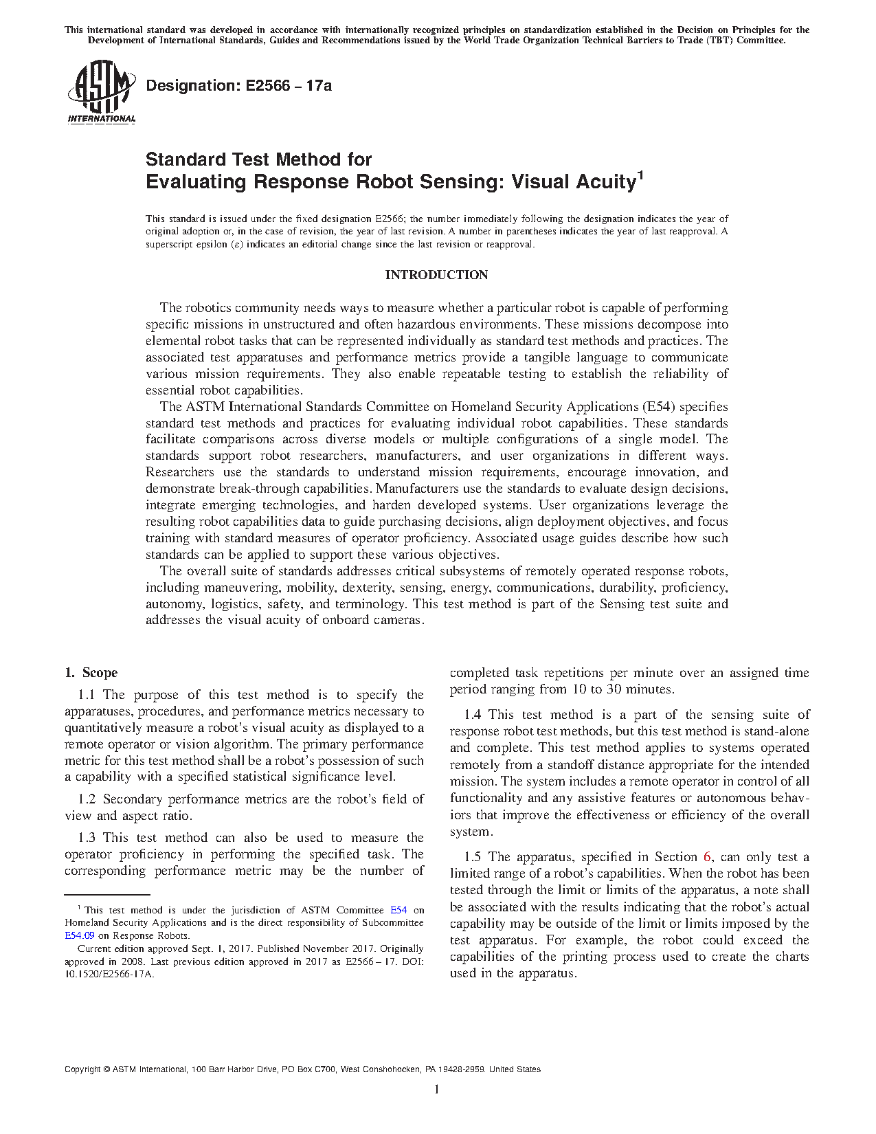1.1 The purpose of this test method is to specify the apparatuses, procedures, and performance metrics necessary to quantitatively measure a robot’s visual acuity as displayed to a remote operator or vision algorithm. The primary performance metric for this test method shall be a robot’s possession of such a capability with a specified statistical significance.