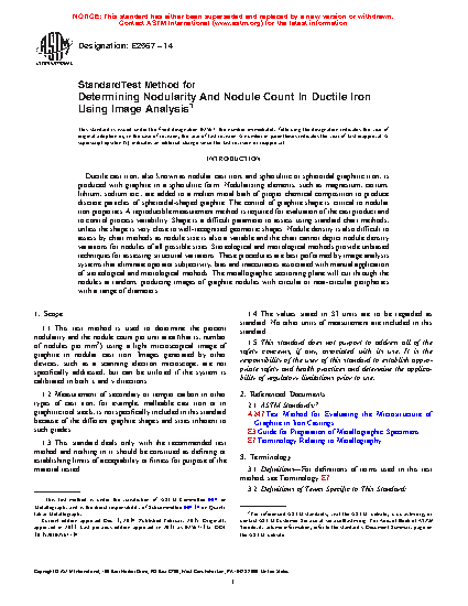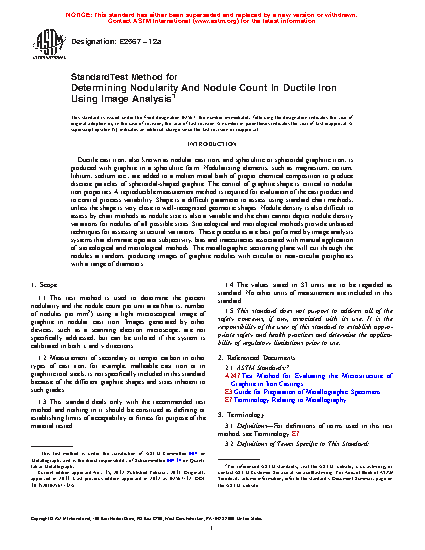 This method defines a procedure for measuring the number of nodules and the quality of nodularity of spherulitic graphite in a cast iron microstructure. The specimen’s location in a casting or cast test specimen, and the orientation of the plane-of-polish, are governed by product standards. When a product standard is not defined, choose the test location randomly or at specific systematically chosen depths as needed. The plane-of-polish may be parallel or perpendicular to the solidification direction, or chosen at random, depending upon the needs of the study.