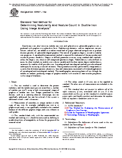 1.1 This test method is used to determine the percent nodularity and the nodule count per unit area (that is, number of nodules per mm2) using a light microscopical image of graphite in nodular cast iron. Images generated by other devices, such as a scanning electron microscope, are not specifically addressed, but can be utilized if the system is calibrated in both x and y directions.