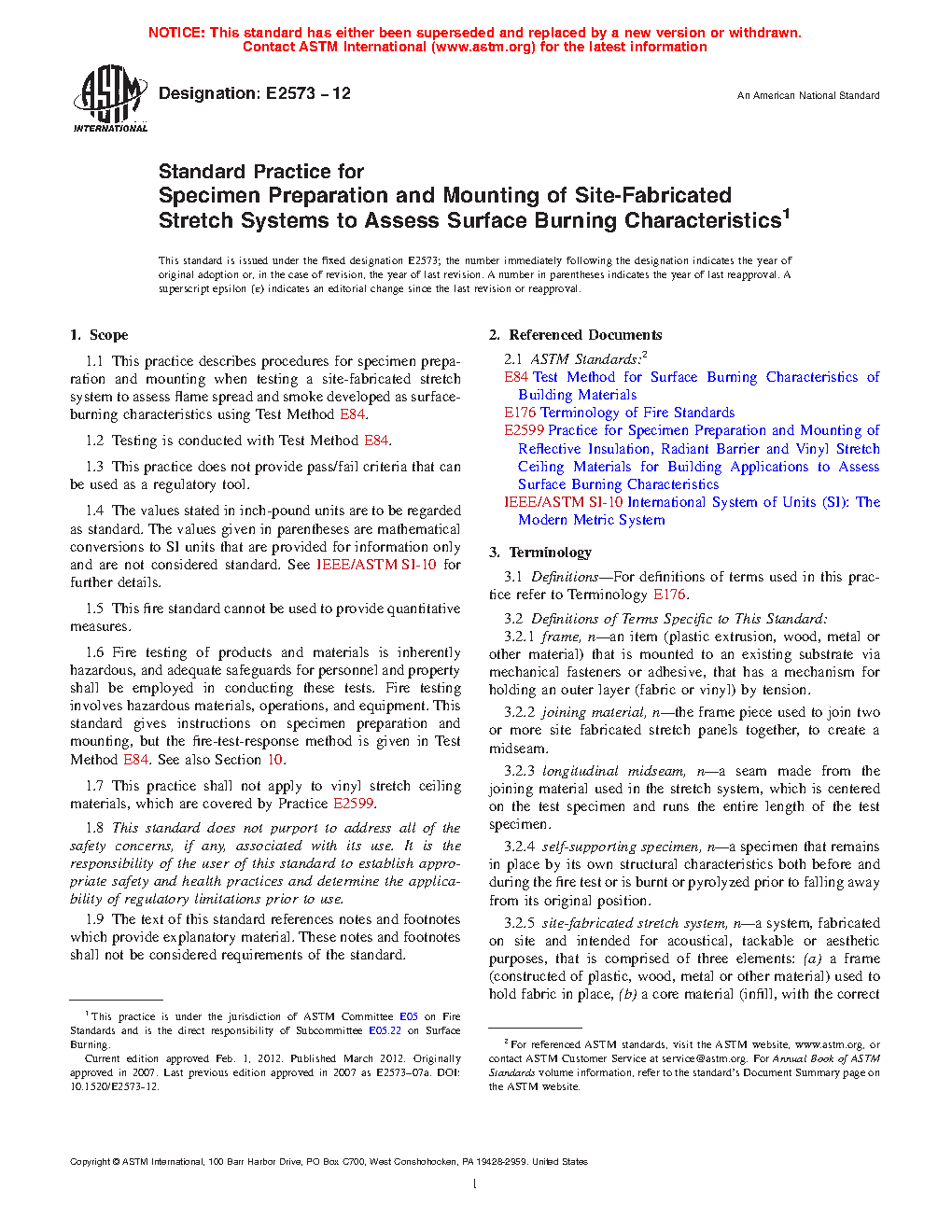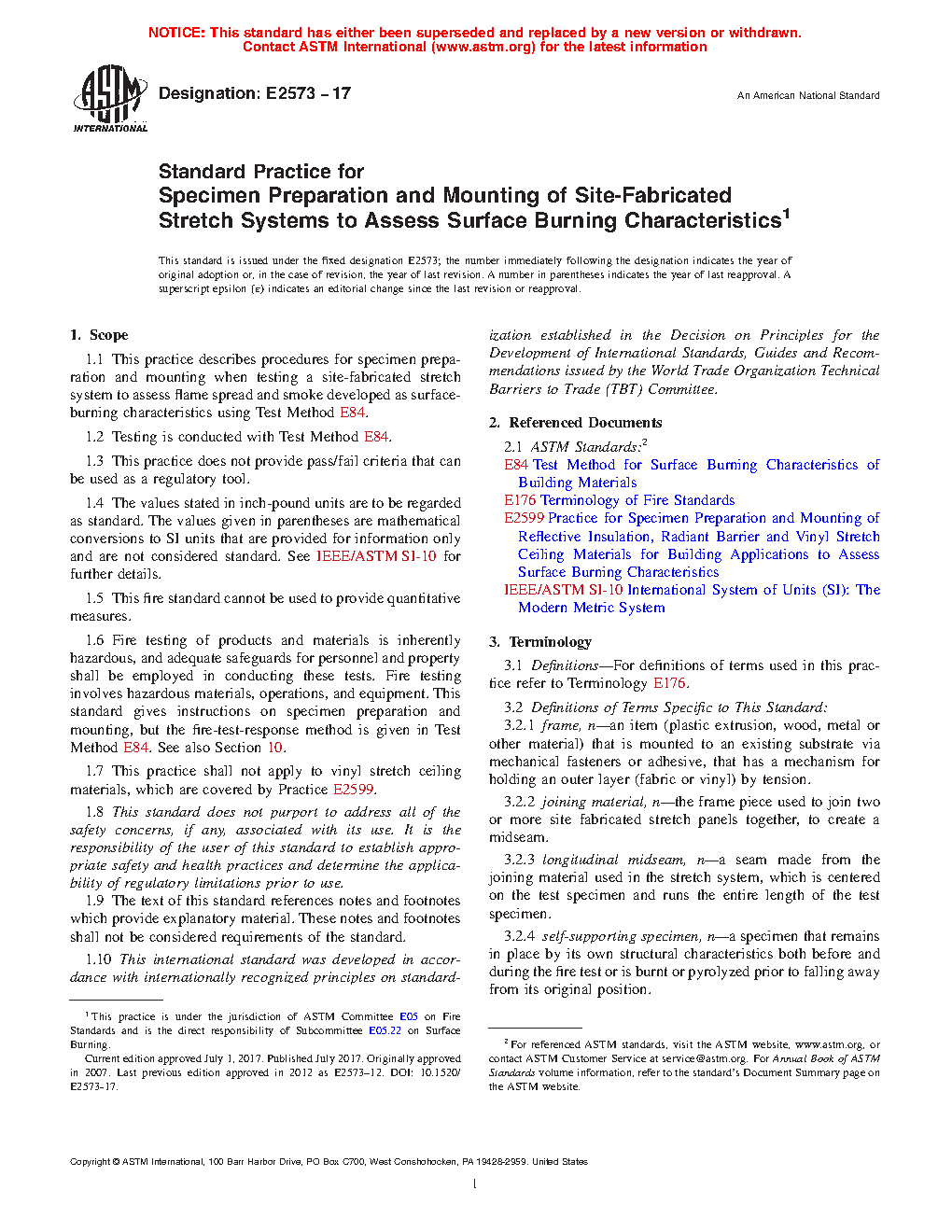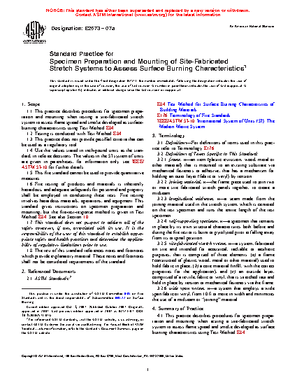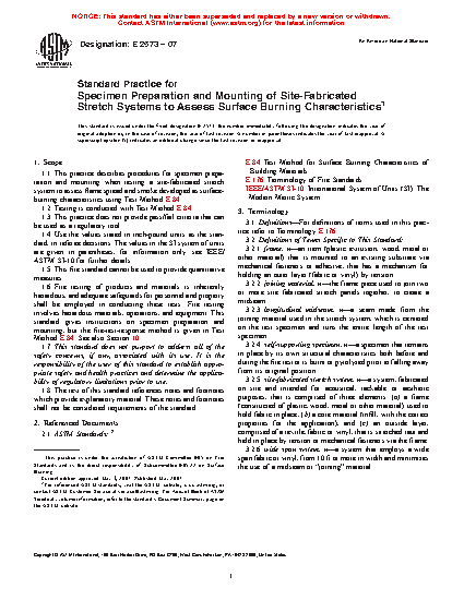 5.1 Site-fabricated stretch systems used as interior finish are evaluated with Test Method E84 to comply with building, fire, or life safety code requirements. This practice describes specimen preparation and mounting procedures for such materials and systems.