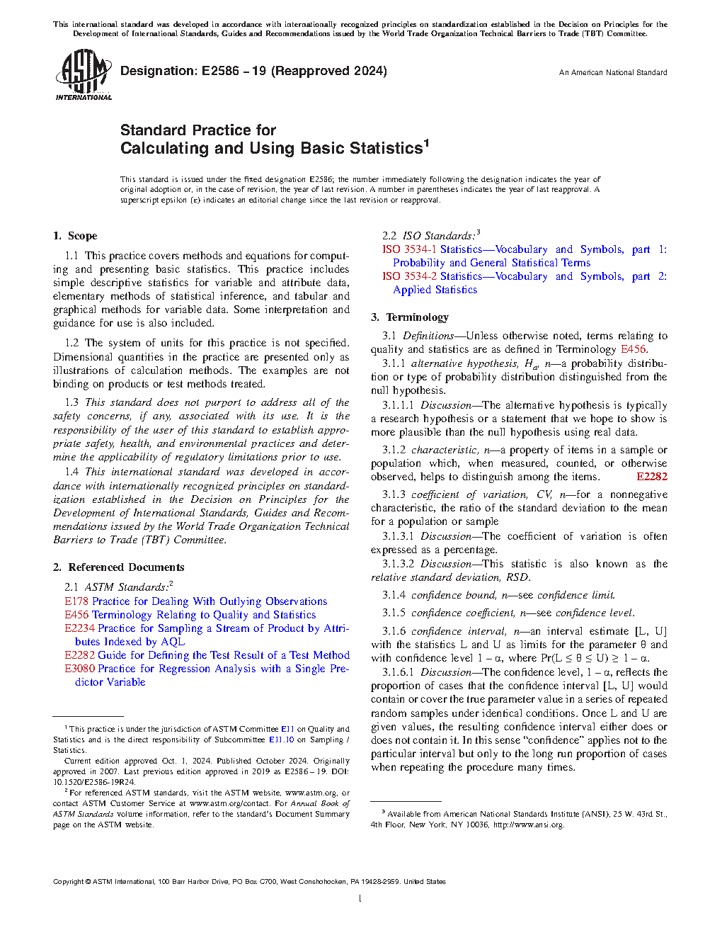 1.1 This practice covers methods and equations for computing and presenting basic descriptive statistics using a set of sample data containing a single variable. This practice includes simple descriptive statistics for variable data, tabular and graphical methods for variable data, and methods for summarizing simple attribute data. Some interpretation and guidance for use is also included.