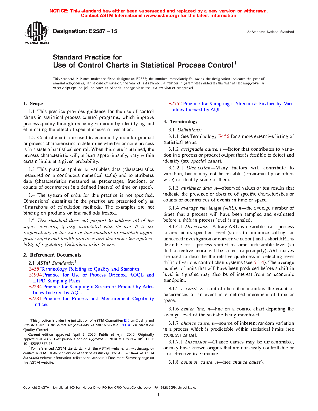 1.1 This practice provides guidance for the use of control charts in statistical process control programs, which improve process quality through reducing variation by identifying and eliminating the effect of special causes of variation.