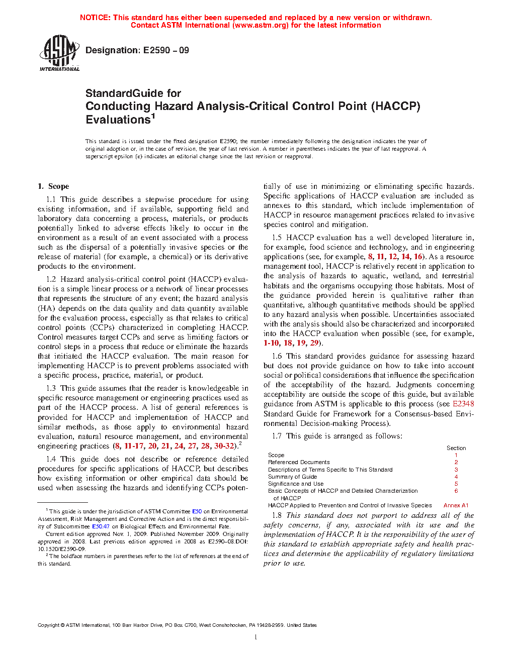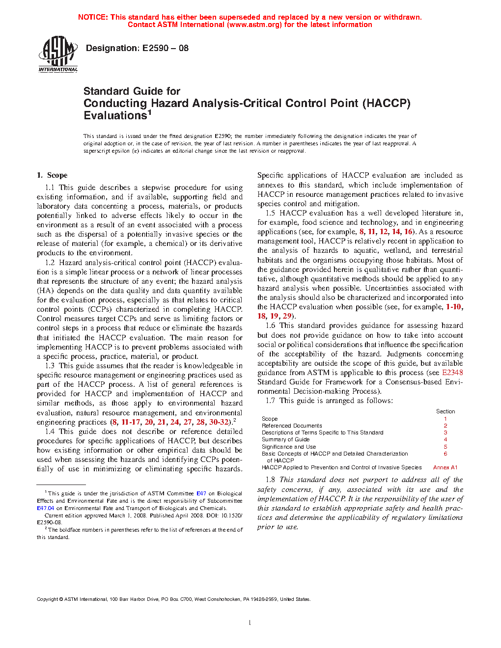 1.4 This guide does not describe or reference detailed procedures for specific applications of HACCP, but describes how existing information or other empirical data should be used when assessing the hazards and identifying CCPs potentially of use in minimizing or eliminating specific hazards. Specific applications of HACCP evaluation are included as annexes to this standard, which include implementation of HACCP in resource management practices related to invasive species control and mitigation.