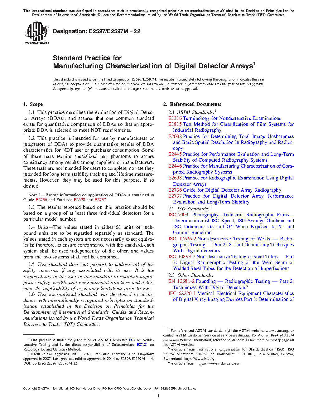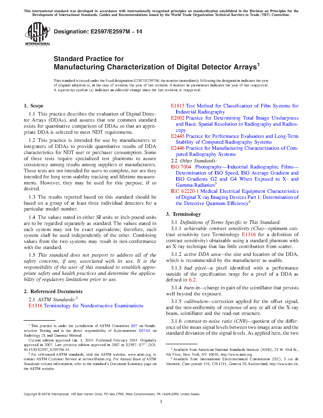1.1 This practice describes the evaluation of Digital Detector Arrays (DDAs), and assures that one common standard exists for quantitative comparison of DDAs so that an appropriate DDA is selected to meet NDT requirements.