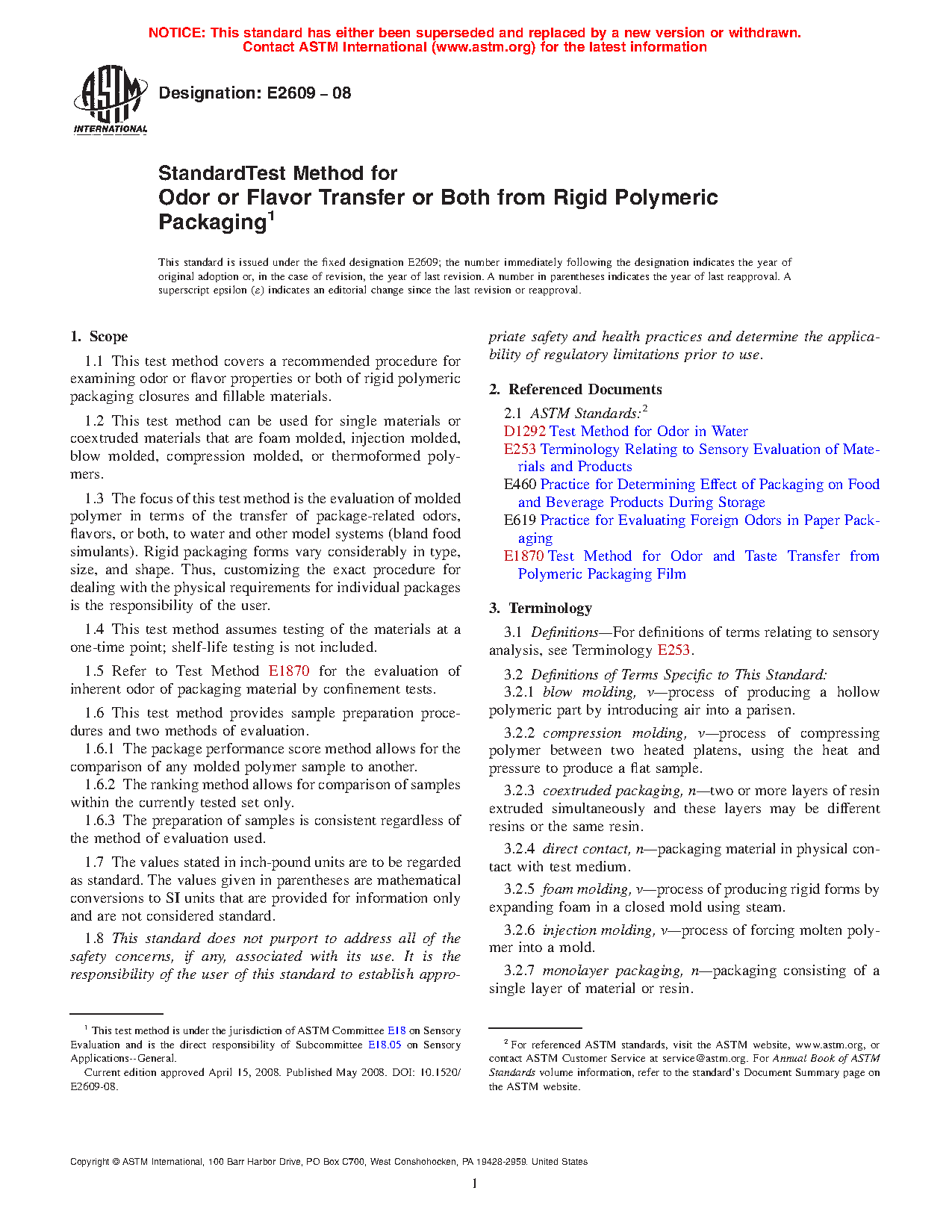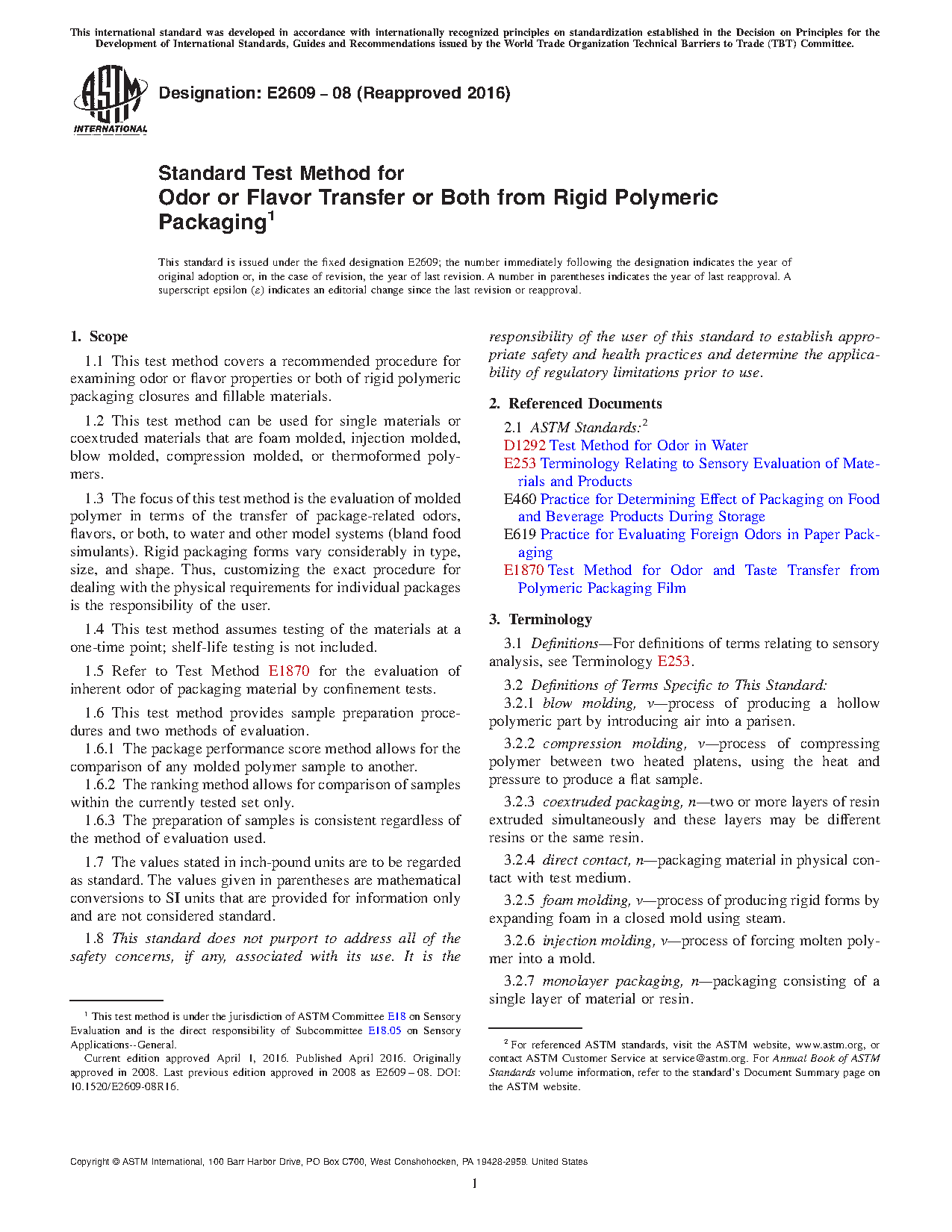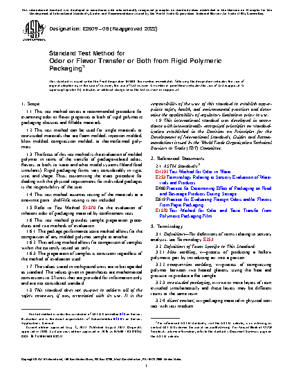 1.3 The focus of this test method is the evaluation of molded polymer in terms of the transfer of package-related odors, flavors, or both, to water and other model systems (bland food simulants). Rigid packaging forms vary considerably in type, size, and shape. Thus, customizing the exact procedure for dealing with the physical requirements for individual packages is the responsibility of the user.