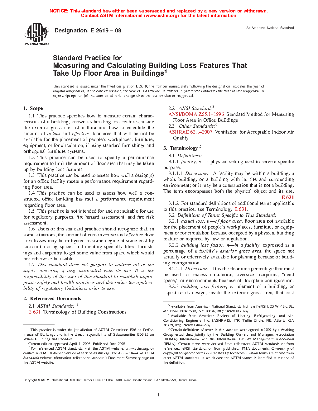 1.1 This practice specifies how to measure certain characteristics of a building, known as building loss features, inside the exterior gross area of a floor and how to calculate the amount of actual and effective floor area that will be not be available for the placement of people’s workplaces, furniture, equipment, or for circulation, if using standard furnishings and orthogonal furniture systems.