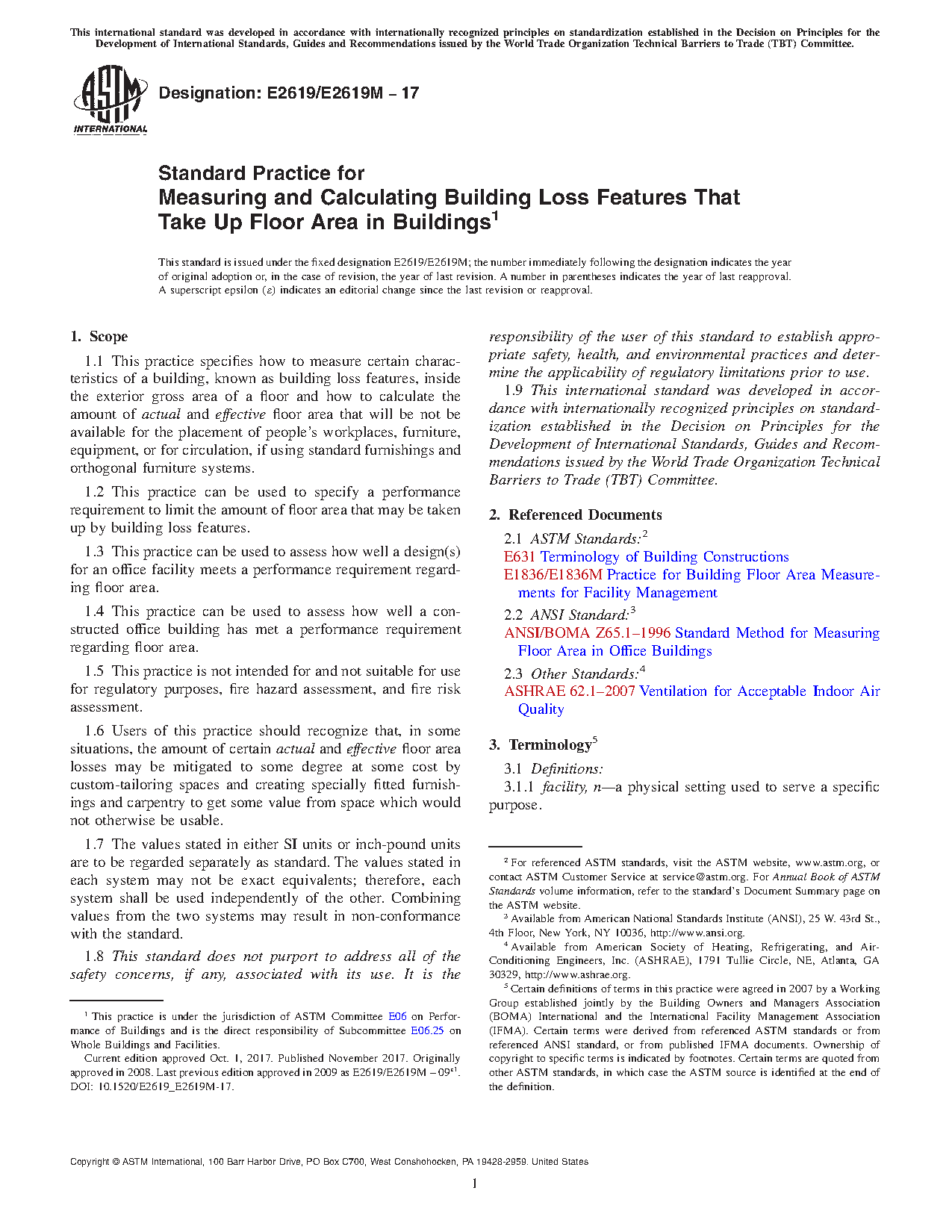 1.1 This practice specifies how to measure certain characteristics of a building, known as building loss features, inside the exterior gross area of a floor and how to calculate the amount of actual and effective floor area that will be not be available for the placement of people’s workplaces, furniture, equipment, or for circulation, if using standard furnishings and orthogonal furniture systems.