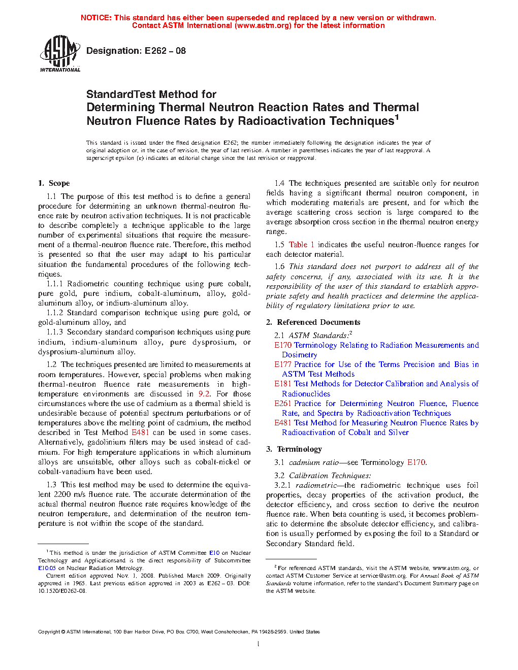 4.3 This test method follows the Stoughton and Halperin convention for reporting thermal neutron fluence. Other conventions are the Wescott convention (followed in Test Method E481) and the Hogdahl convention. Practice E261 explains the three conventions and gives conversion formulae relating values determined by the different conventions. Reference (1)3 discusses the three thermal-neutron conventions in detail.