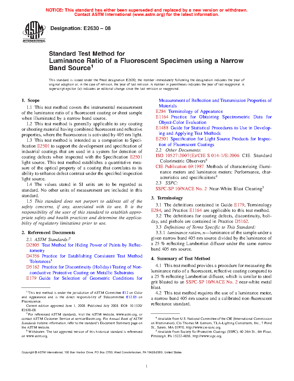1.3 This test method is intended as a companion to Specification E2501 to support the development and specification of industrial coatings that are used in a system for detection of coating defects when inspected with the Specification E2501 light source. This test method establishes a quantitative measure of the optical property of a coating that correlates to its ability to enhance defect contrast under the specified inspection light source.
