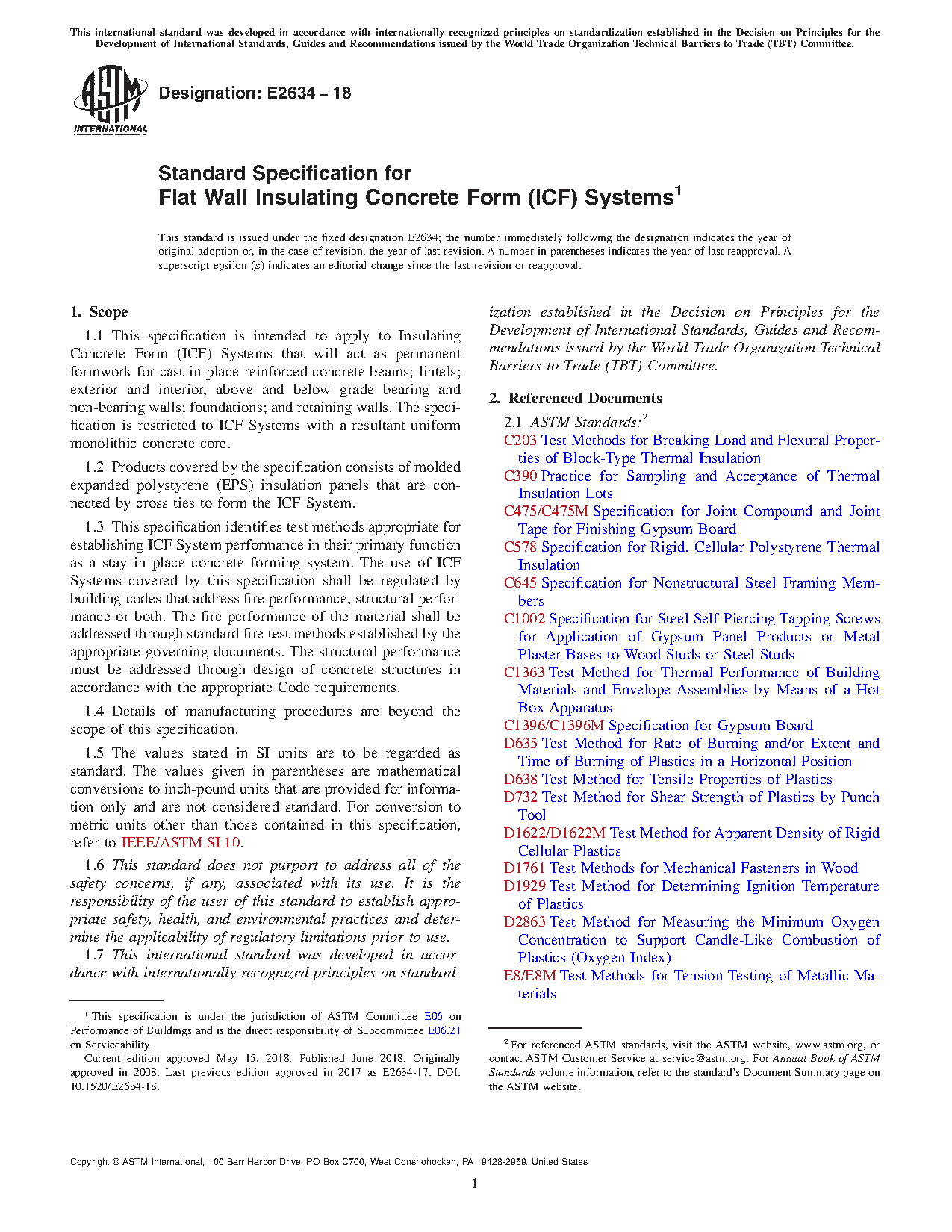 1.3 This specification identifies test methods appropriate for establishing ICF System performance in their primary function as a stay in place concrete forming system. The use of ICF Systems covered by this specification shall be regulated by building codes that address fire performance, structural performance or both. The fire performance of the material shall be addressed through standard fire test methods established by the appropriate governing documents. The structural performance must be addressed through design of concrete structures in accordance with the appropriate Code requirements.