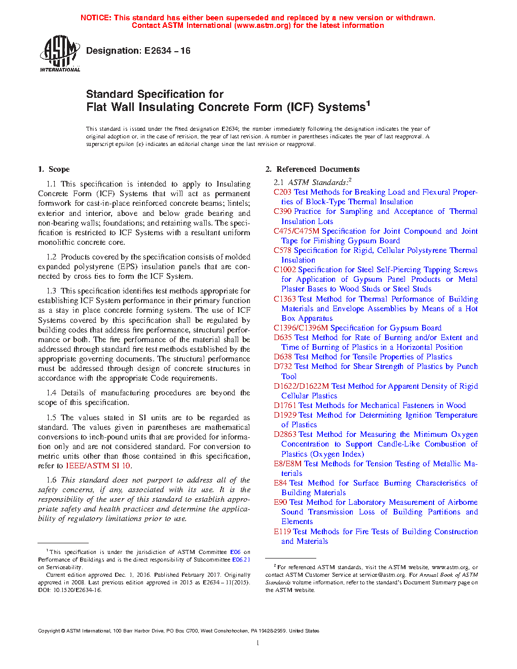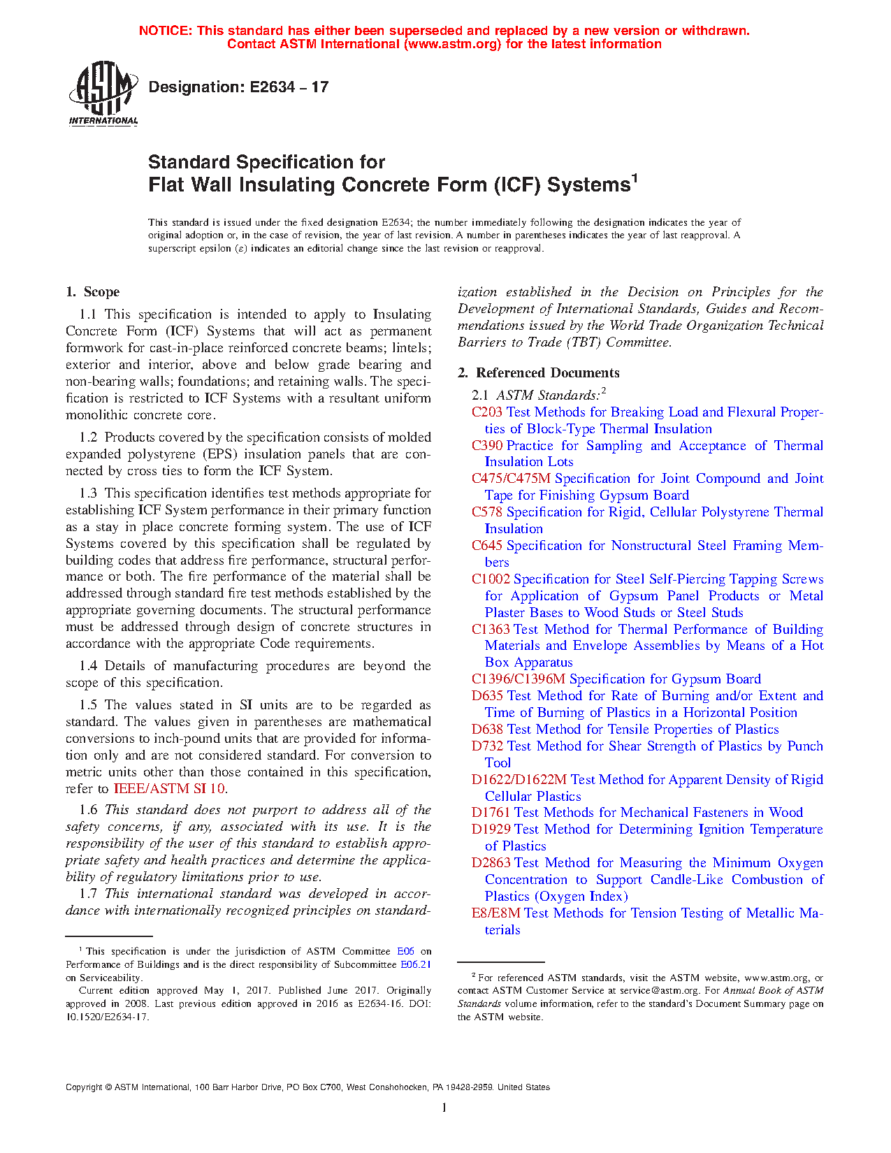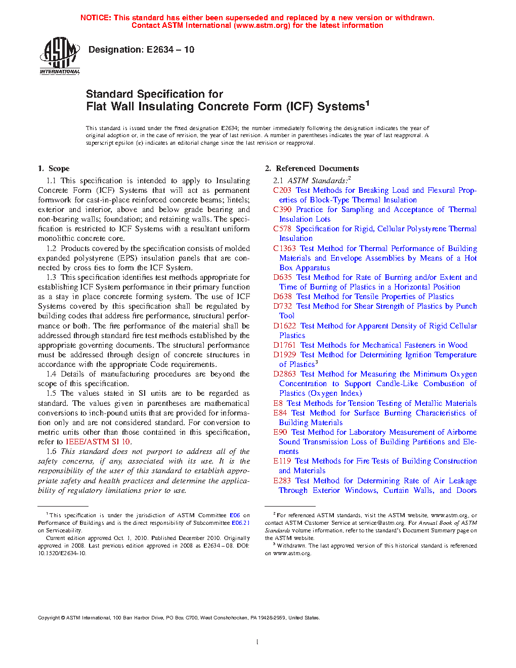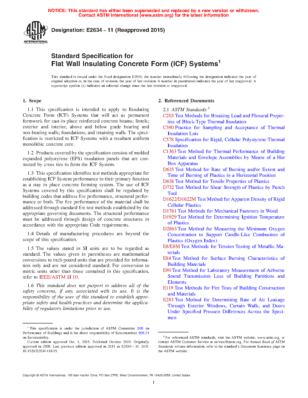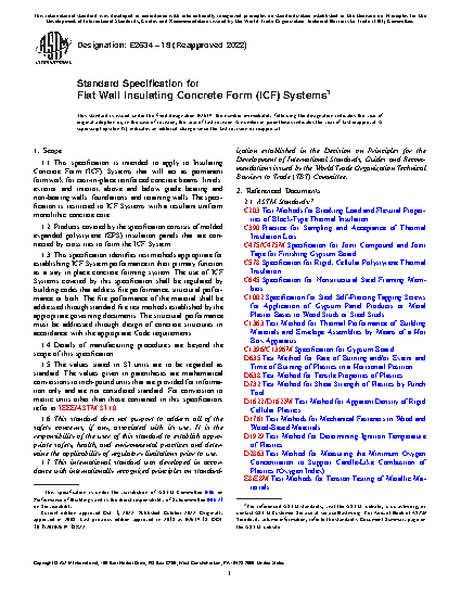1.3 This specification identifies test methods appropriate for establishing ICF System performance in their primary function as a stay in place concrete forming system. The use of ICF Systems covered by this specification shall be regulated by building codes that address fire performance, structural performance or both. The fire performance of the material shall be addressed through standard fire test methods established by the appropriate governing documents. The structural performance must be addressed through design of concrete structures in accordance with the appropriate Code requirements.