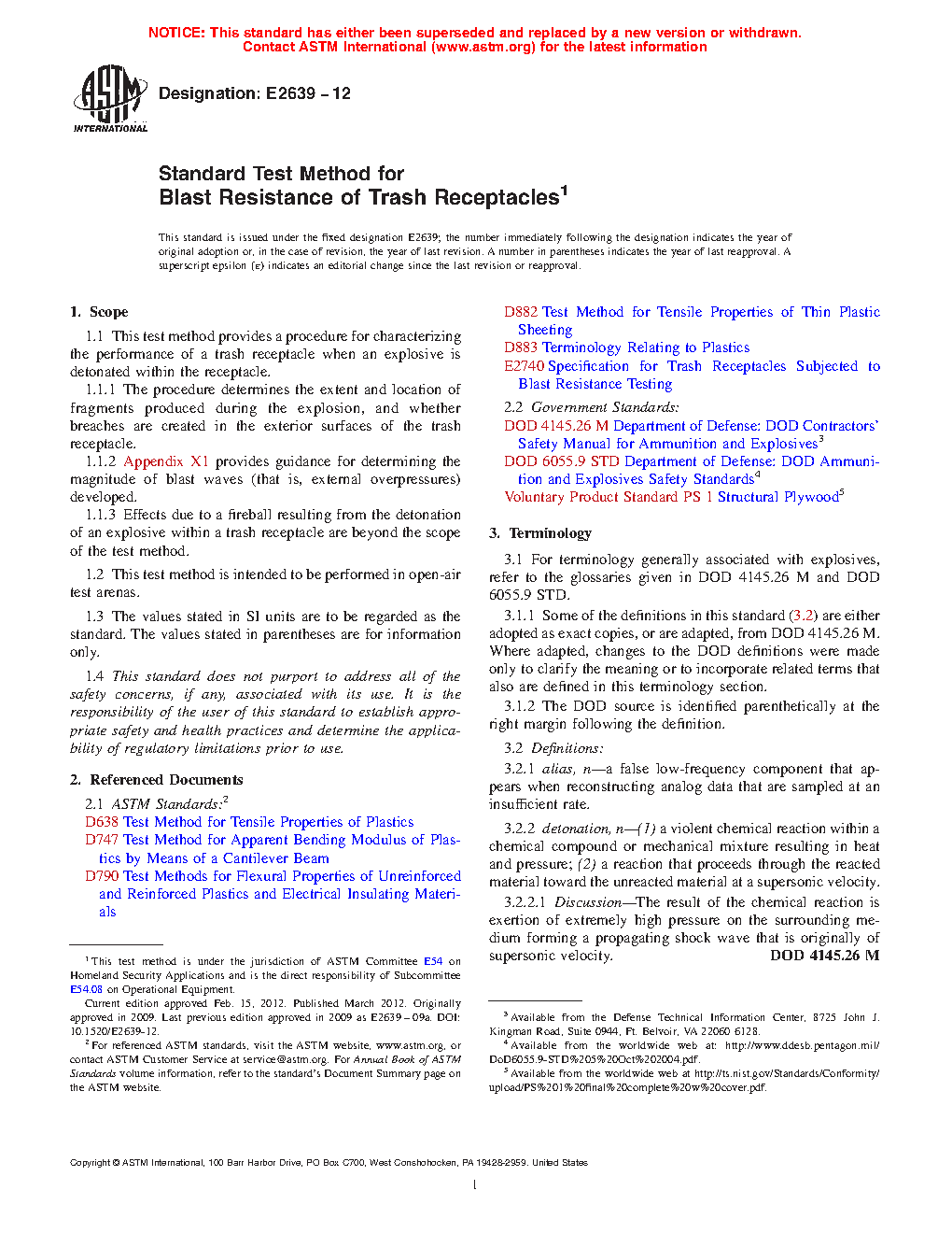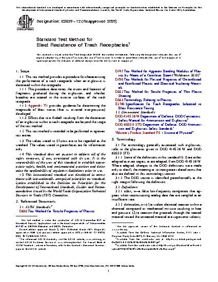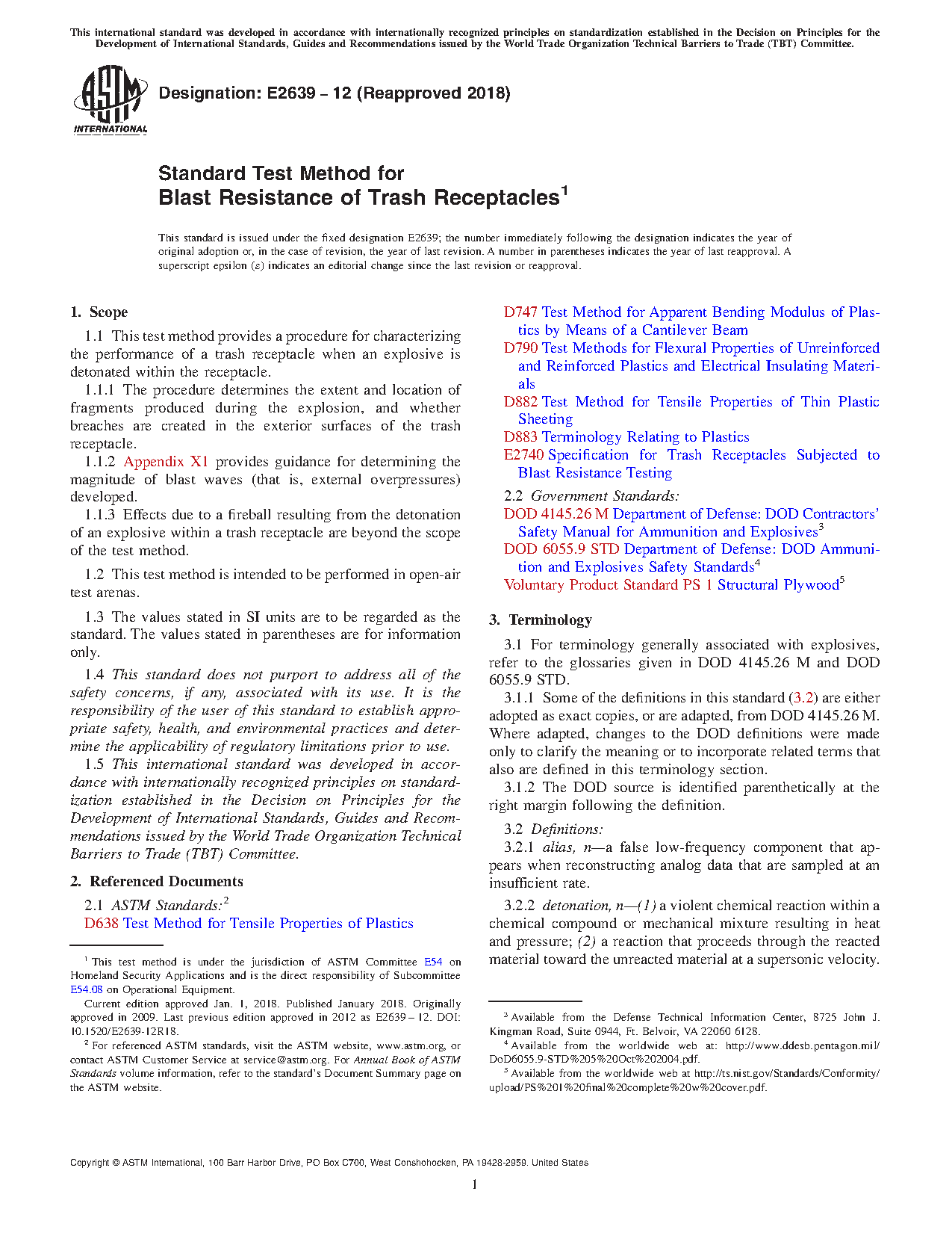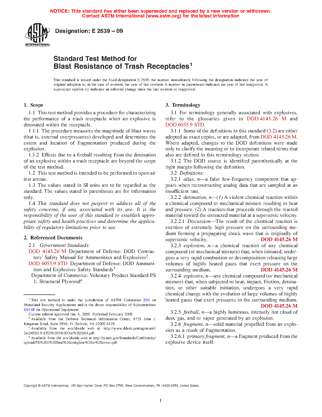 1.1 This test method provides a procedure for characterizing the performance of a trash receptacle when an explosive is detonated within the receptacle.
