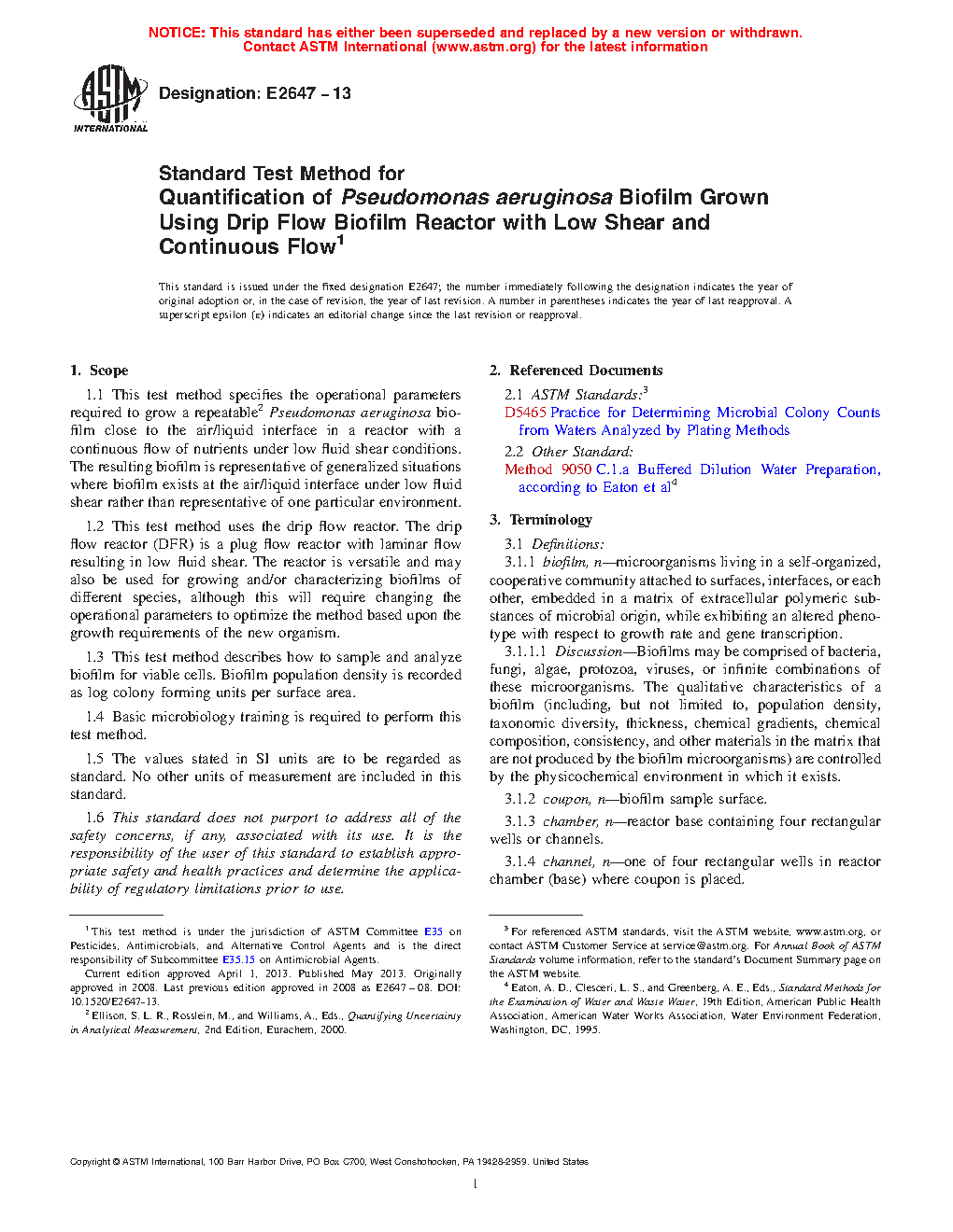1.1 This test method specifies the operational parameters required to grow a repeatable2 Pseudomonas aeruginosa biofilm close to the air/liquid interface in a reactor with a continuous flow of nutrients under low fluid shear conditions. The resulting biofilm is representative of generalized situations where biofilm exists at the air/liquid interface under low fluid shear rather than representative of one particular environment.