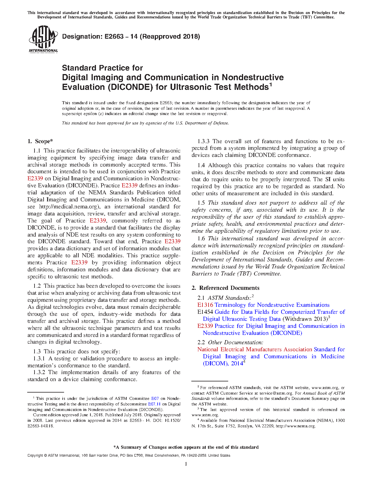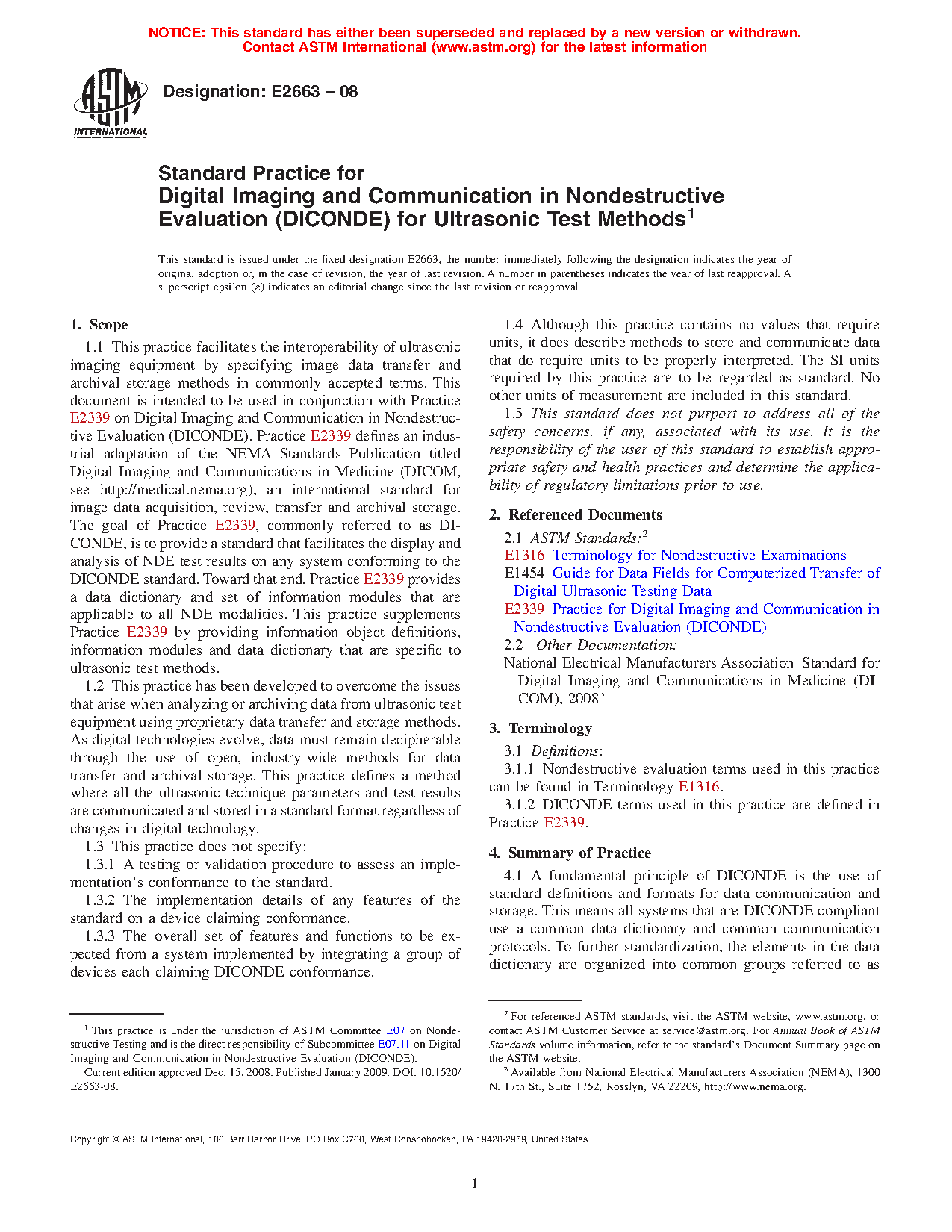 1.1 This practice facilitates the interoperability of ultrasonic imaging equipment by specifying image data transfer and archival storage methods in commonly accepted terms. This document is intended to be used in conjunction with Practice E2339 on Digital Imaging and Communication in Nondestructive Evaluation (DICONDE). Practice E2339 defines an industrial adaptation of the NEMA Standards Publication titled Digital Imaging and Communications in Medicine (DICOM, see http://medical.nema.org), an international standard for image data acquisition, review, transfer and archival storage. The goal of Practice E2339, commonly referred to as DICONDE, is to provide a standard that facilitates the display and analysis of NDE test results on any system conforming to the DICONDE standard. Toward that end, Practice E2339 provides a data dictionary and set of information modules that are applicable to all NDE modalities. This practice supplements Practice E2339 by providing information object definitions, information modules and data dictionary that are specific to ultrasonic test methods.