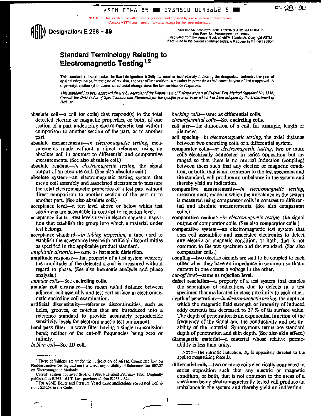 Definitions of Terms Relating to Electromagnetic Testing (Withdrawn 1991)