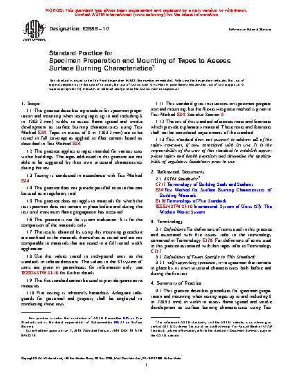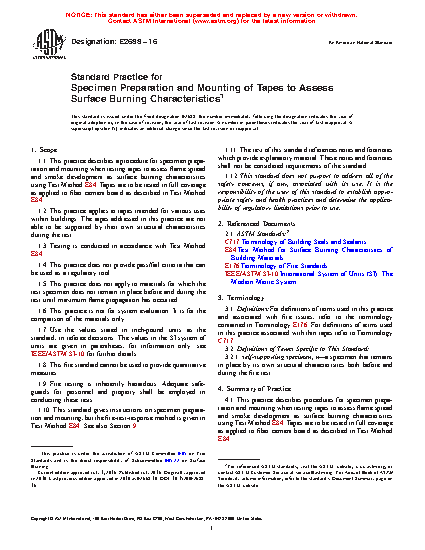 1.1 This practice describes a procedure for specimen preparation and mounting when testing tapes to assess flame spread and smoke development as surface burning characteristics using Test Method E84. Tapes are to be tested in full coverage as applied to fiber cement board as described in Test Method E84.