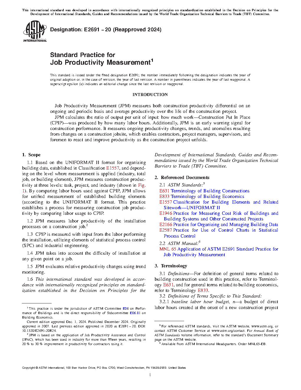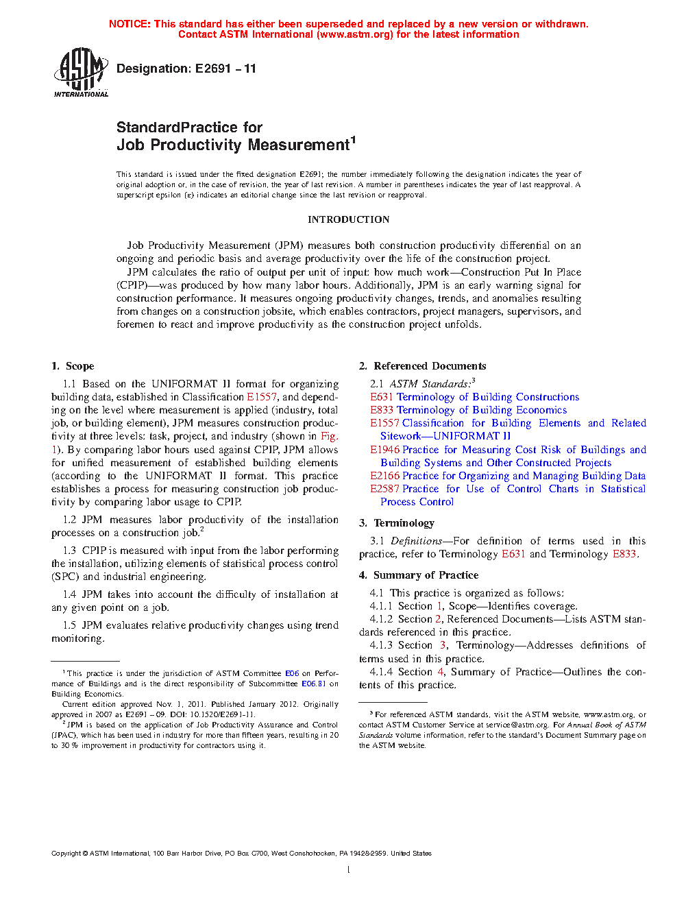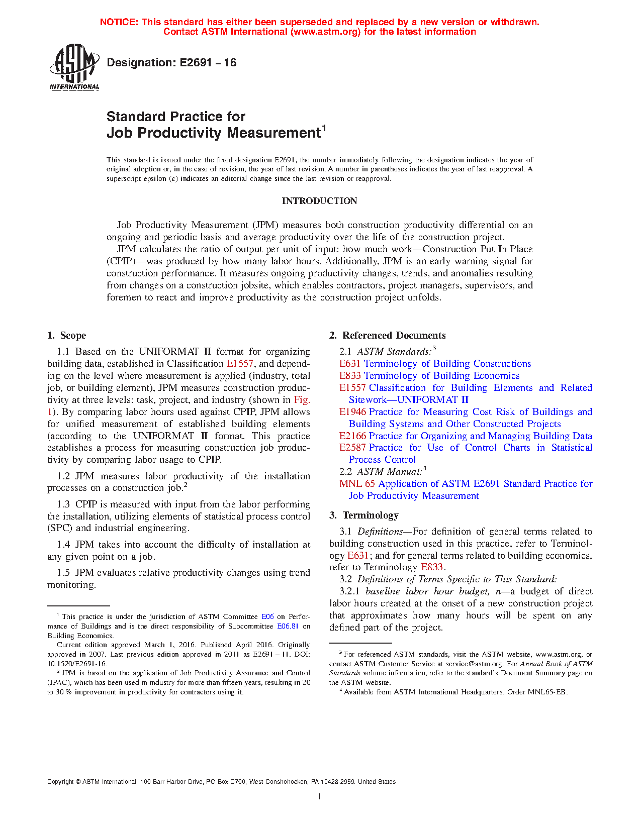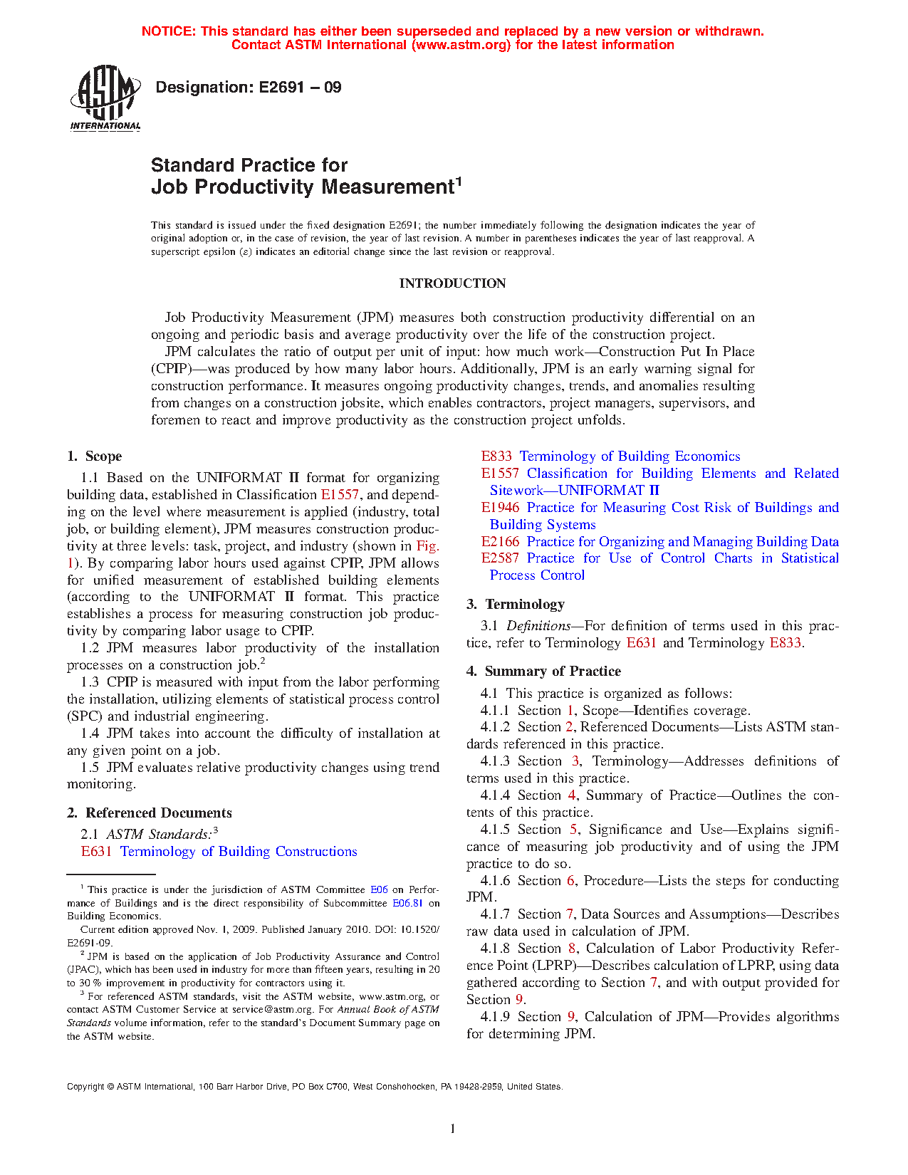 1.1 Based on the UNIFORMAT II format for organizing building data, established in Classification E1557, and depending on the level where measurement is applied (industry, total job, or building element), JPM measures construction productivity at three levels: task, project, and industry (shown in Fig. 1). By comparing labor hours used against CPIP, JPM allows for unified measurement of established building elements (according to the UNIFORMAT II format. This practice establishes a process for measuring construction job productivity by comparing labor usage to CPIP.
