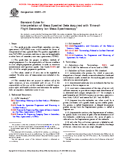 1.1 This guide provides time-of-flight secondary ion mass spectrometry (ToF-SIMS) users with a method for forms of interpretation of mass spectral data. This guide is applicable to most ToF-SIMS instruments and may or may not be applicable to other forms of secondary icon mass spectrometry (SIMS).