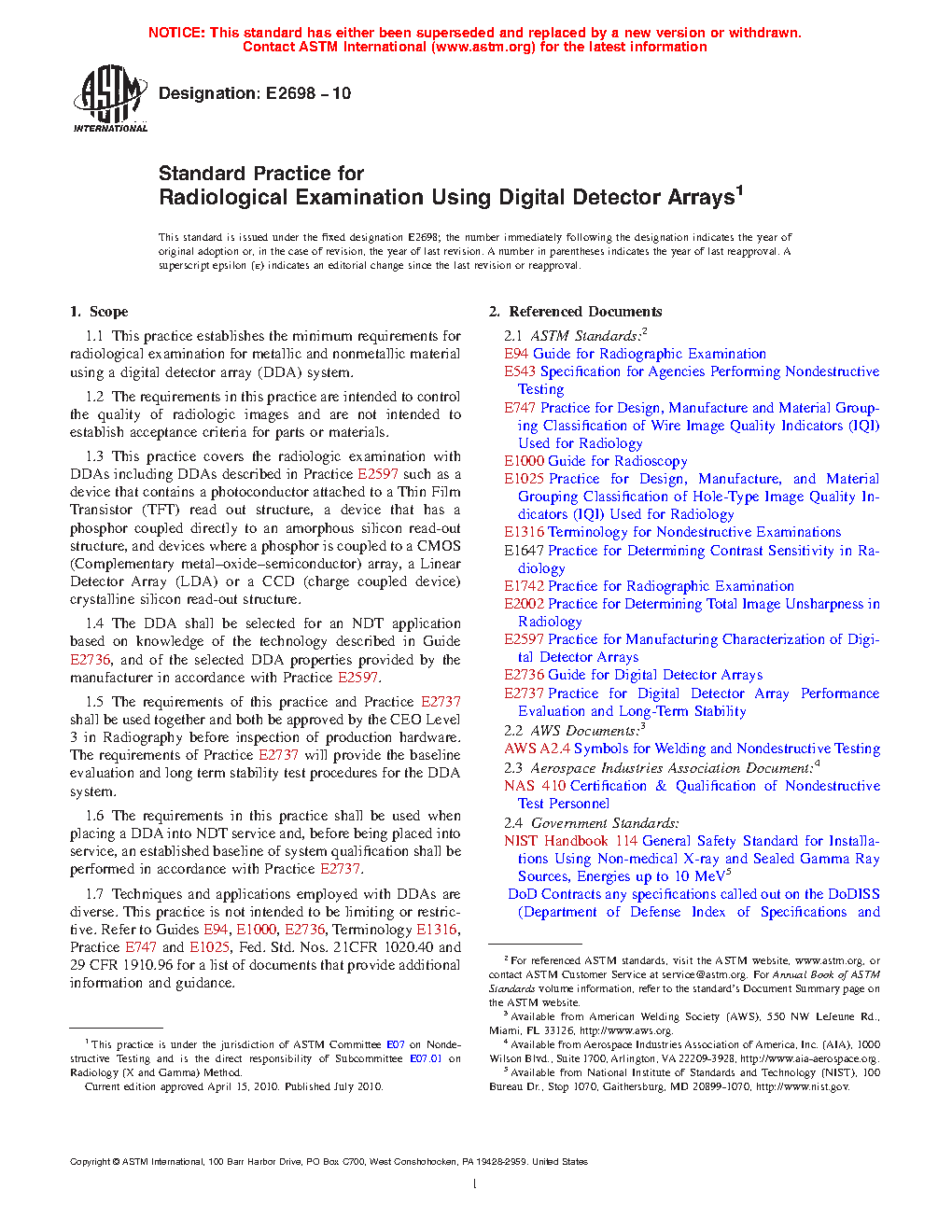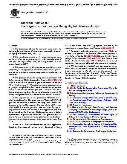 1.1 This practice establishes the minimum requirements for radiographic examination of metallic and nonmetallic materials using digital detector arrays (DDAs).
