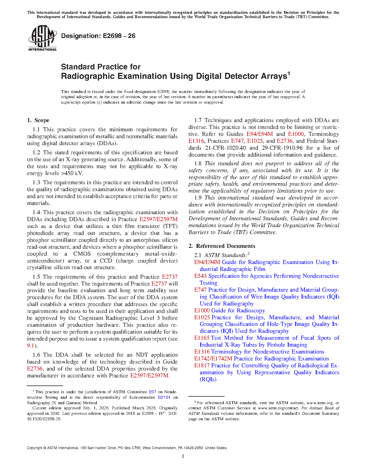 1.3 The requirements in this practice are intended to control the quality of radiographic examinations obtained using DDAs and are not intended to establish acceptance criteria for parts or materials.